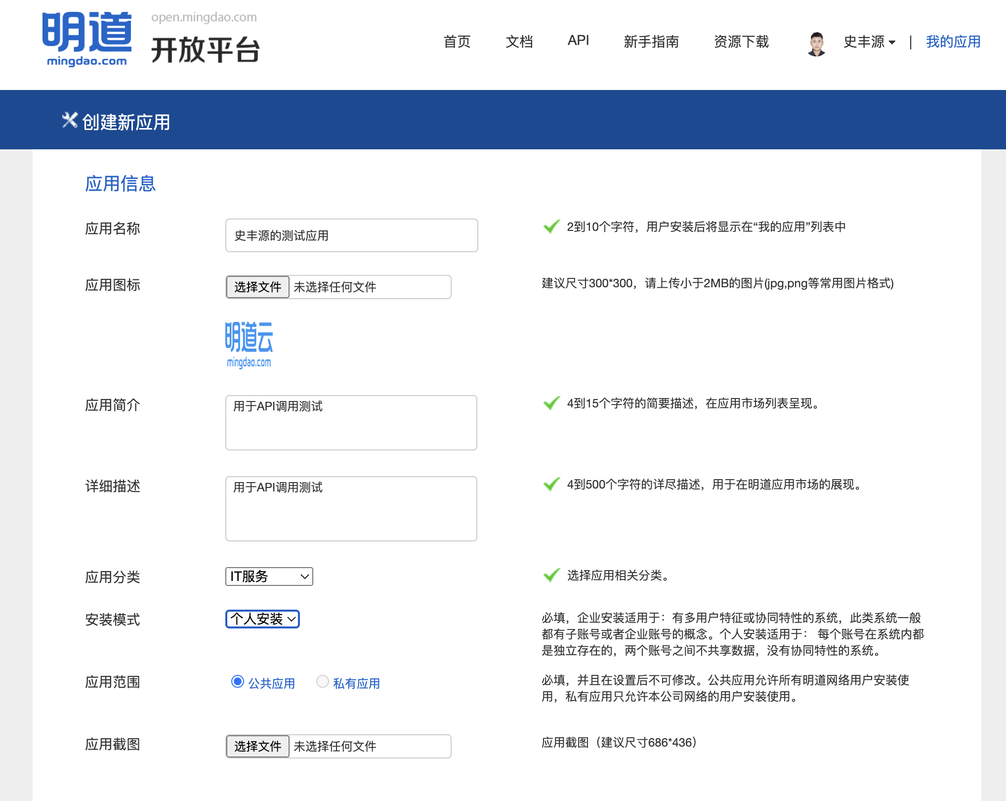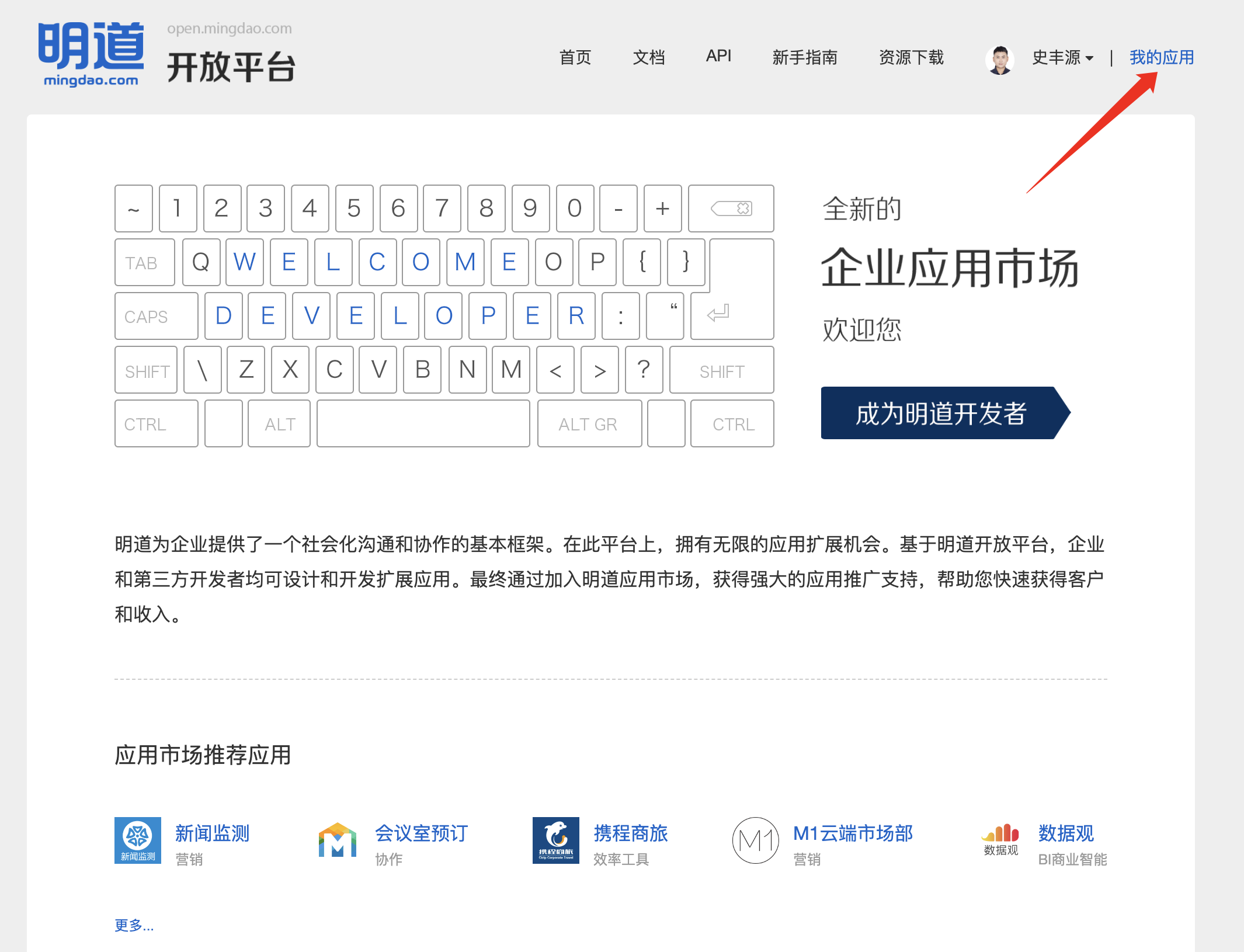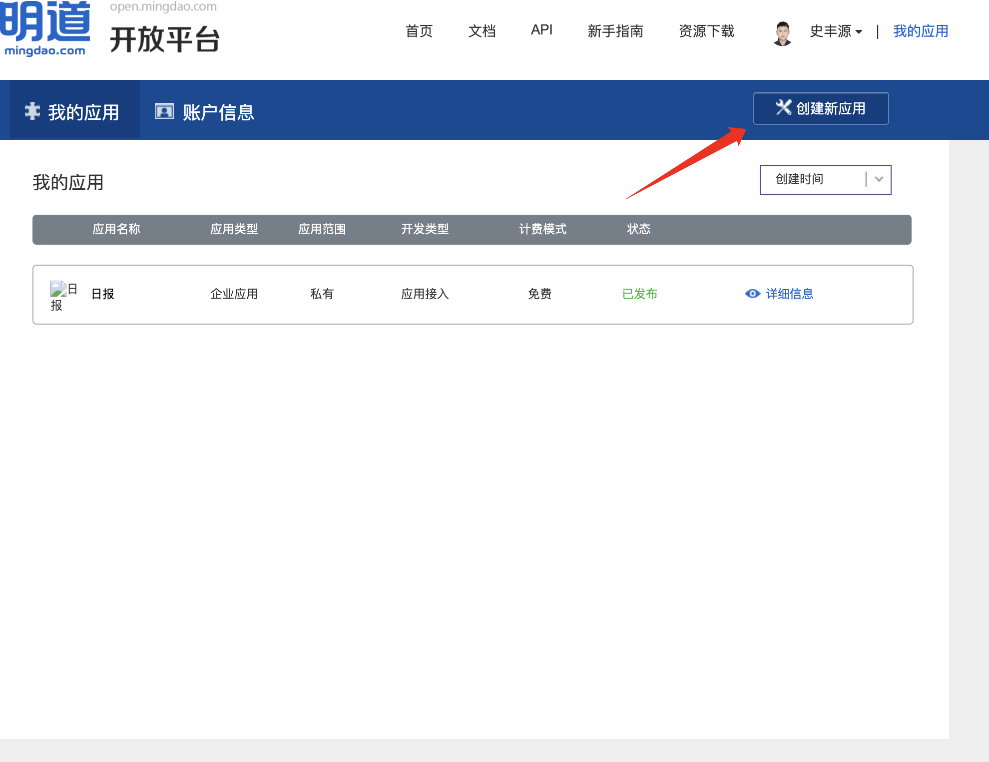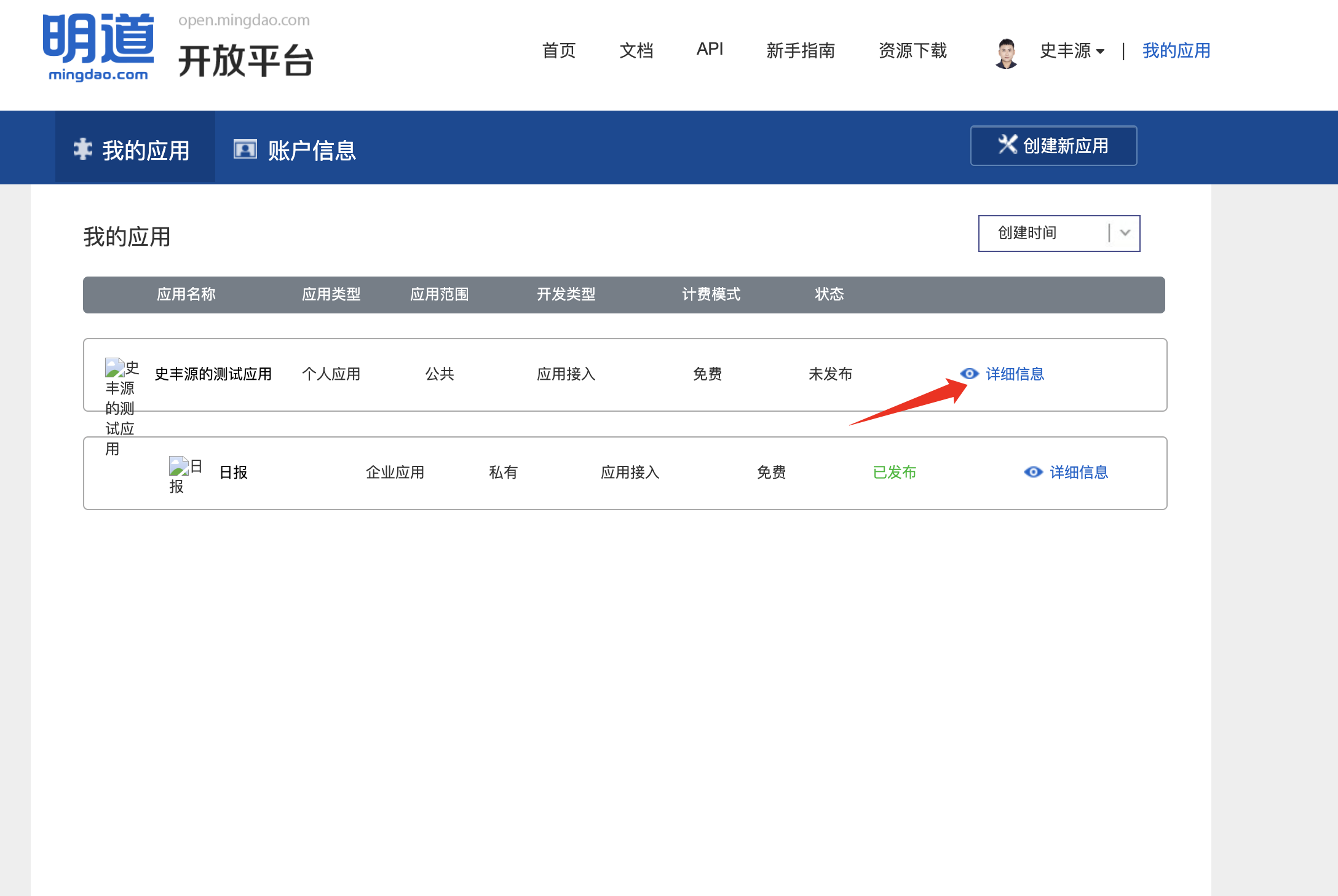 - https://open.mingdao.com/先创建一个应用(先用明道账号登录),点击“我的应用”