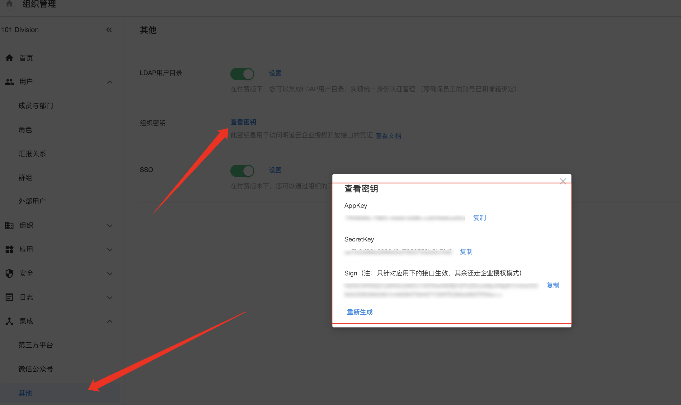组织管理 -集成- 其他 - 查看密钥,注意:这里不要随便点击重新生成,否则会影响别人已经在用的流程。