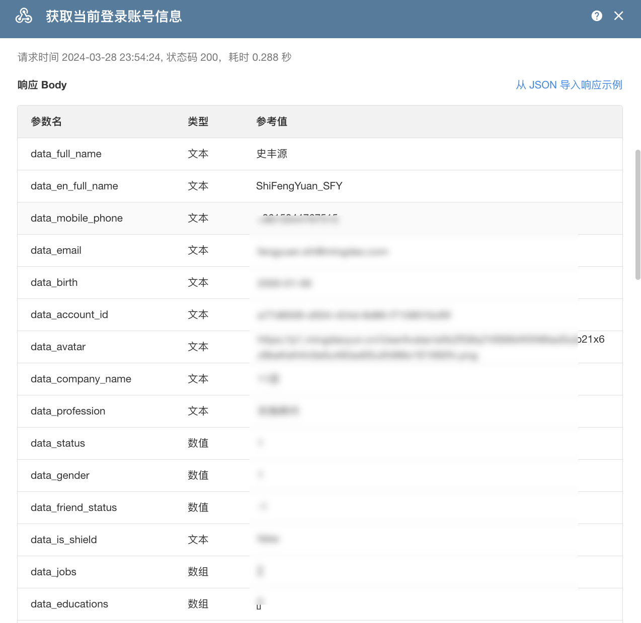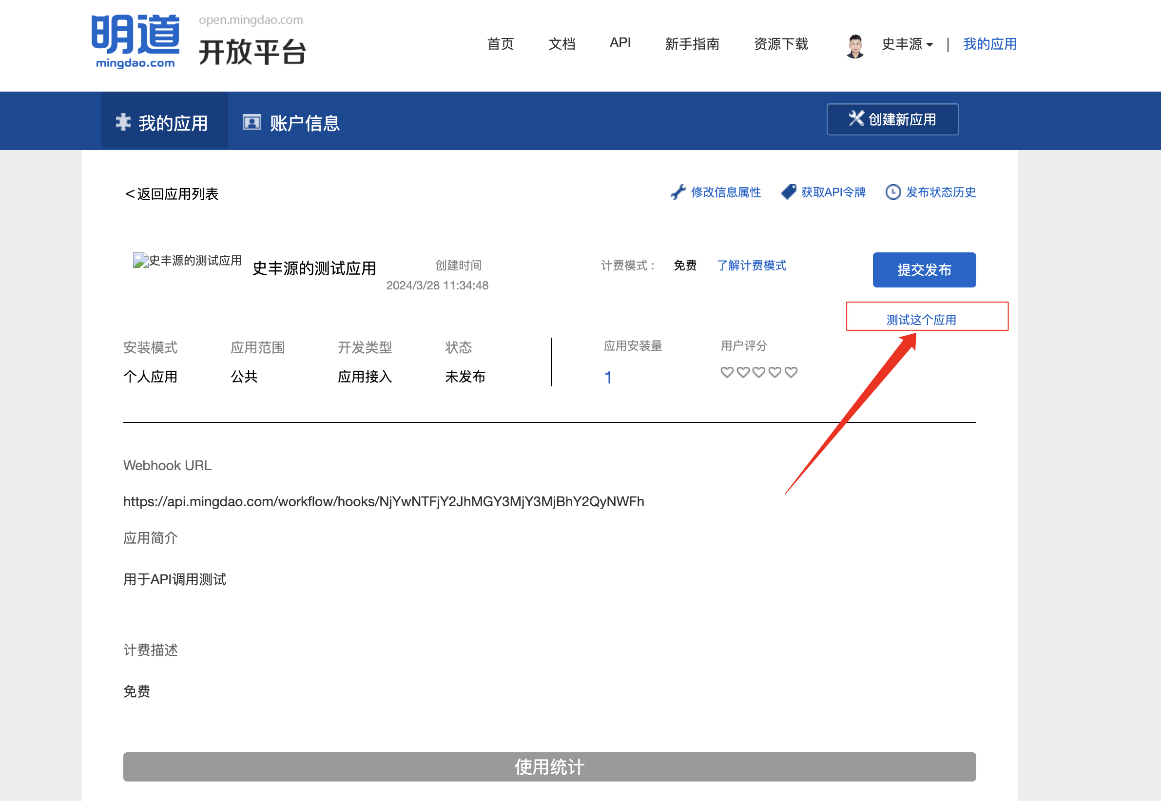 - 选择一个接口进行调用,这里我用了个简单的接口进行测试。(https://open.mingdao.com/doc/v1/user/get_user_card)