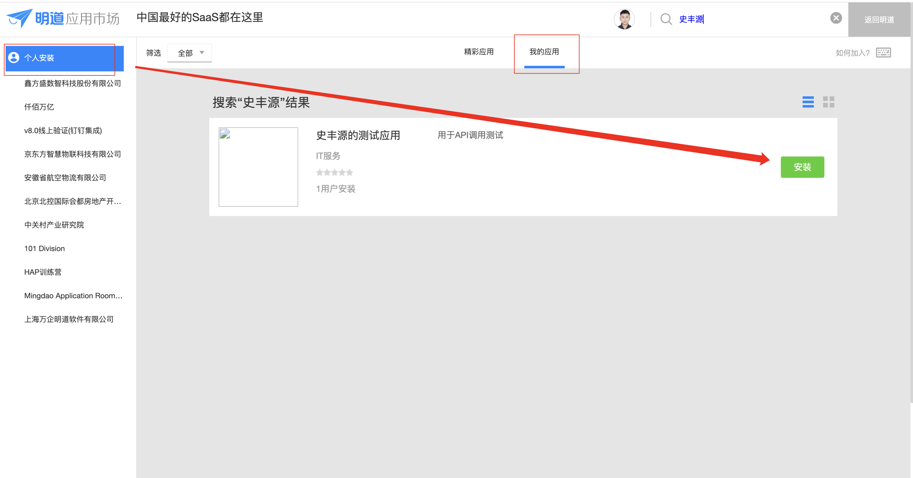 - https://app.mingdao.com/根据名称搜索你上面建立的应用,点击安装。