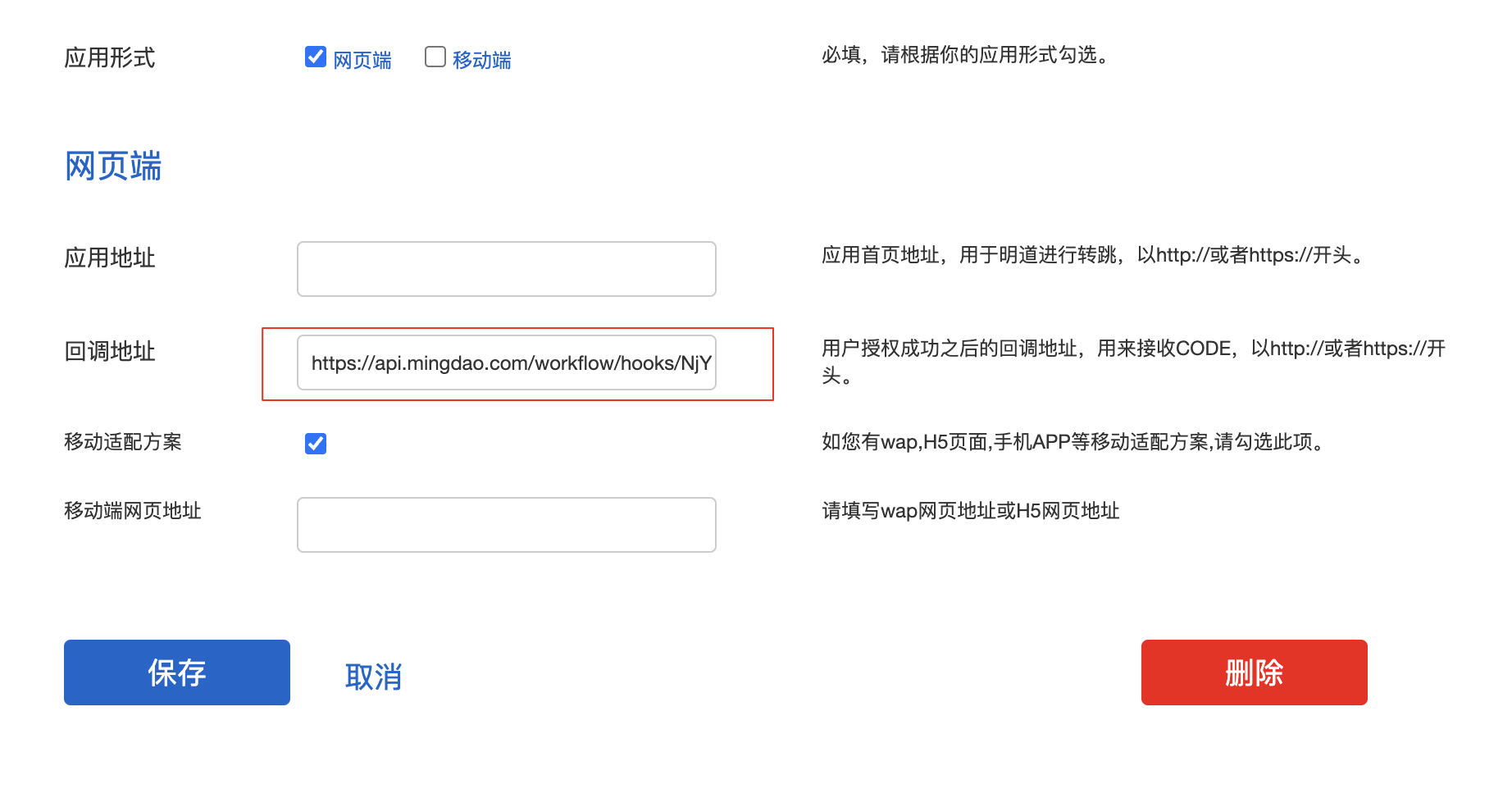 - 应用名称、图标、简介、描述、分类,这些内容随便填一下。应用范围选择“公共应用”。注意下面有个回调地址,后面需要用到,这里可以随便填写一个地址,比如明道云 webhook 自动生成的地址。