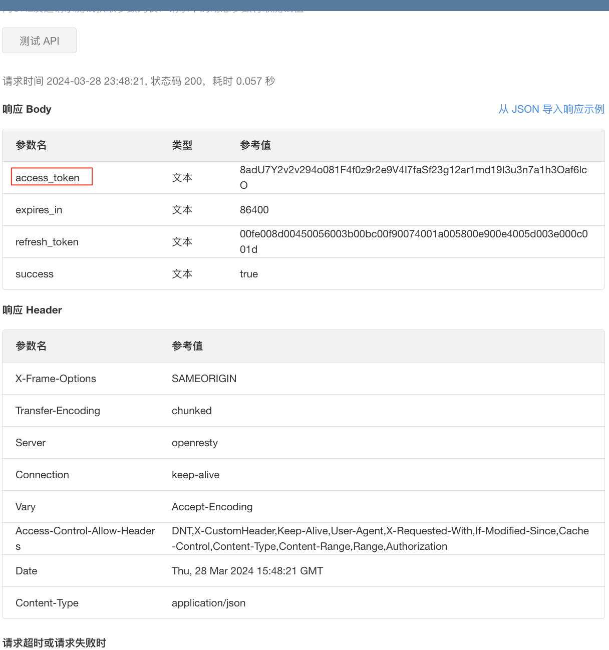 - 返回的 access_token 就是我们需要的令牌,可供后续接口调用验证。