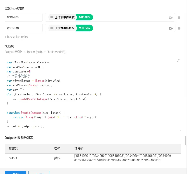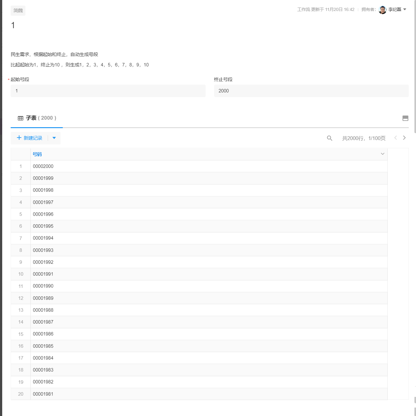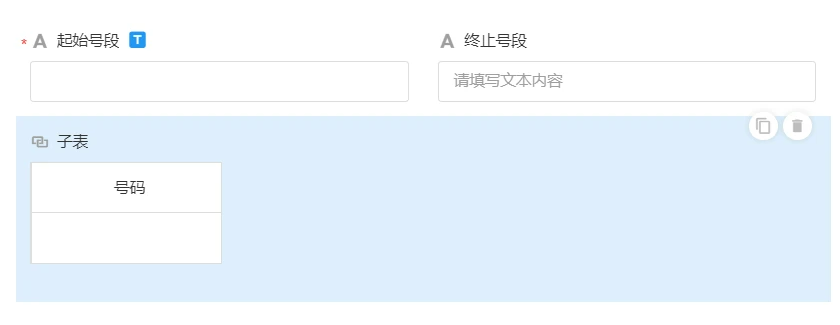 字段名字段类型默认值起始号段文本终止号段文本子表子表——号码数值。这个需要用代码实现,根据起始和终止,计算需要遍历几次,然后根据计算结果便利循环生成数组,再根据数组新增数据即可