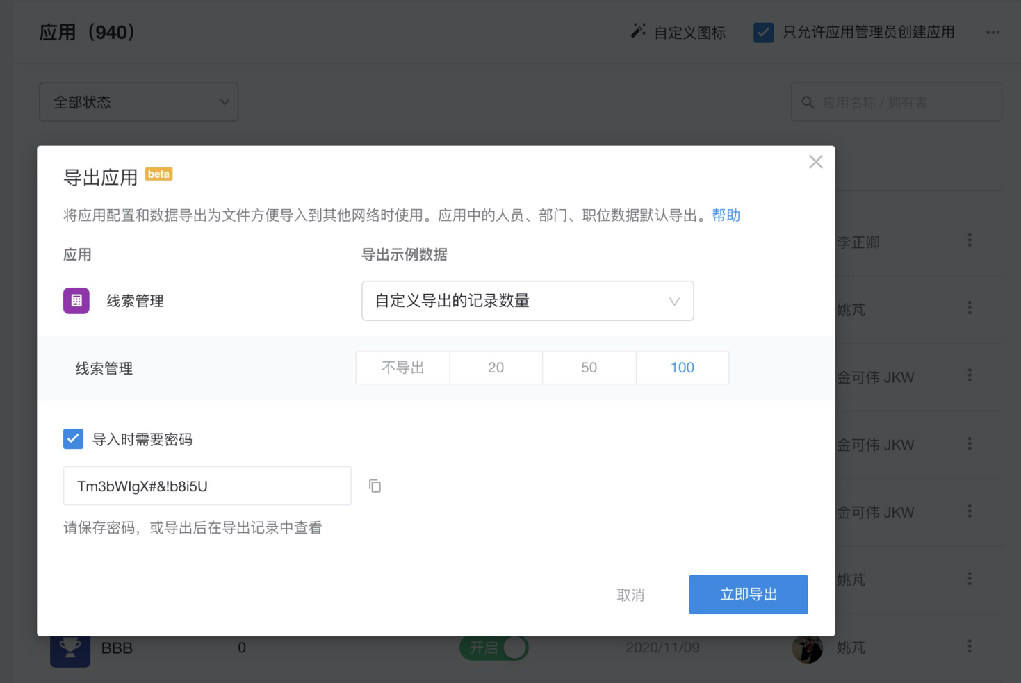 其中,应用结构包括工作表、工作流、角色等,以及其相关的配置;应用数据包括记录、应用中的人员、部门职位等相关数据,并支持导出关联关系和数据批量导出。导出应用时,可以选择是否对应用文件加密,加密的文件在导入时需要密码验证。