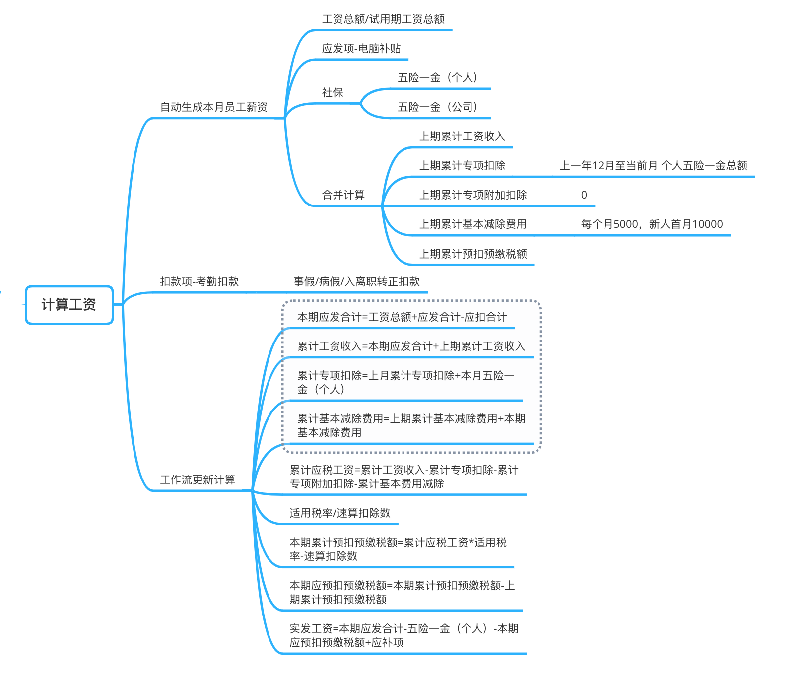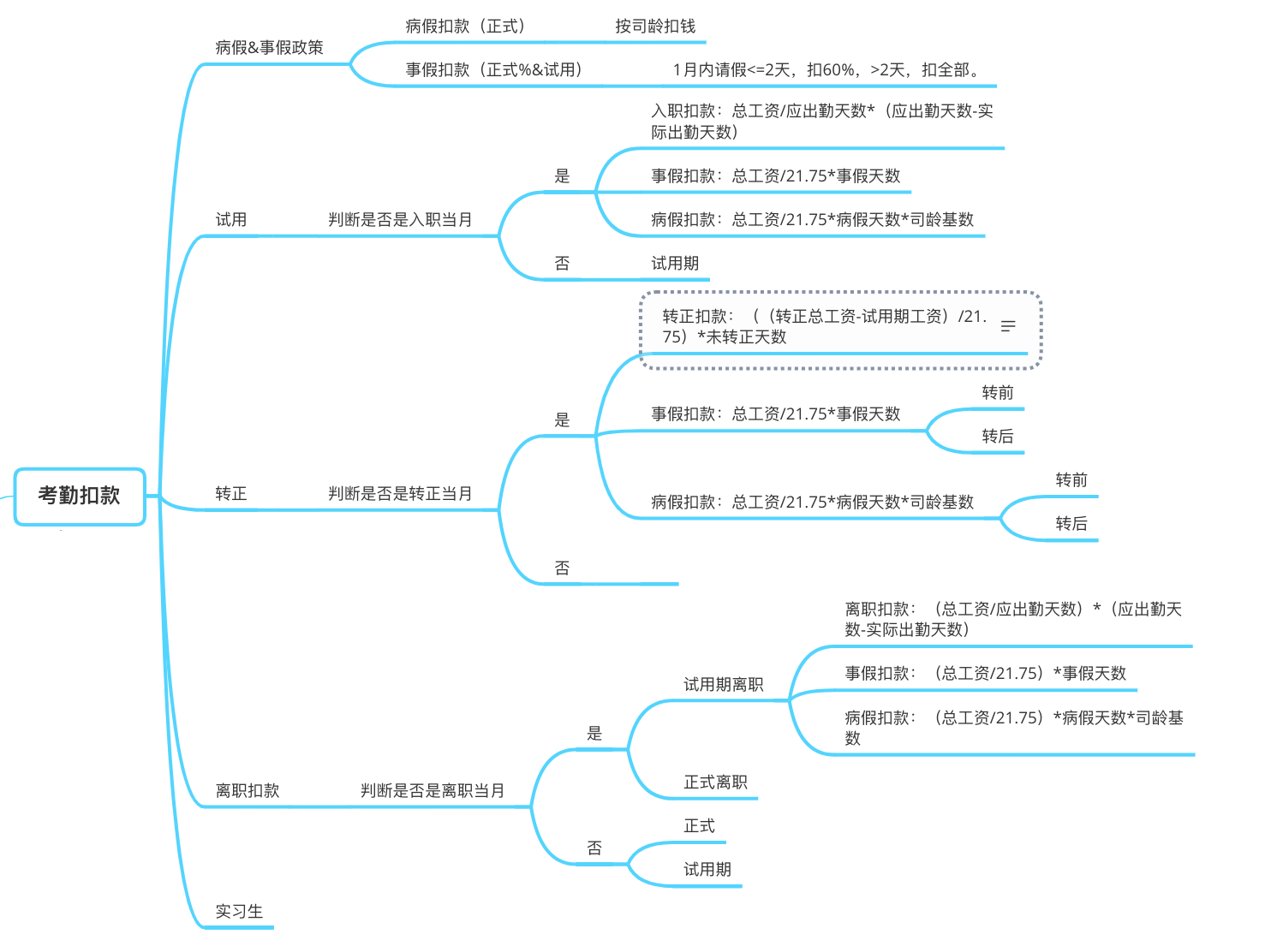 明道云强大的工作流能力,可处理高度复杂的考勤扣款规则,通过员工工作状态(试用、正式、离职等)和工龄,适用不同的扣款规则。我们来感受一下较为通用的考勤扣款规则:主要包括不同状态人员的病假和事假扣款。