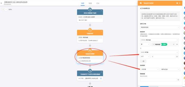 进入【查询库存】按入库时间先后排序的子流程设计界面,这时候的触发条件是发货计划明细表,批量获取产品档案所关联的库存(注意条件,库存量必须大于 0,同时排序规则是入库日期最旧的在前)然后继续将批量获取出来的库存量生成子表。