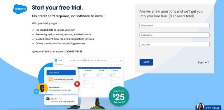相比较,Salesforce 的免费试用是完全开放的,只要提交,立刻就可以开通。