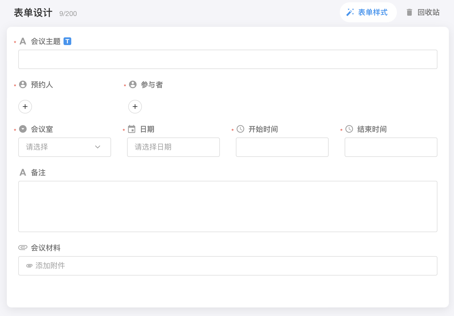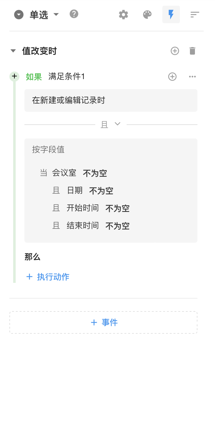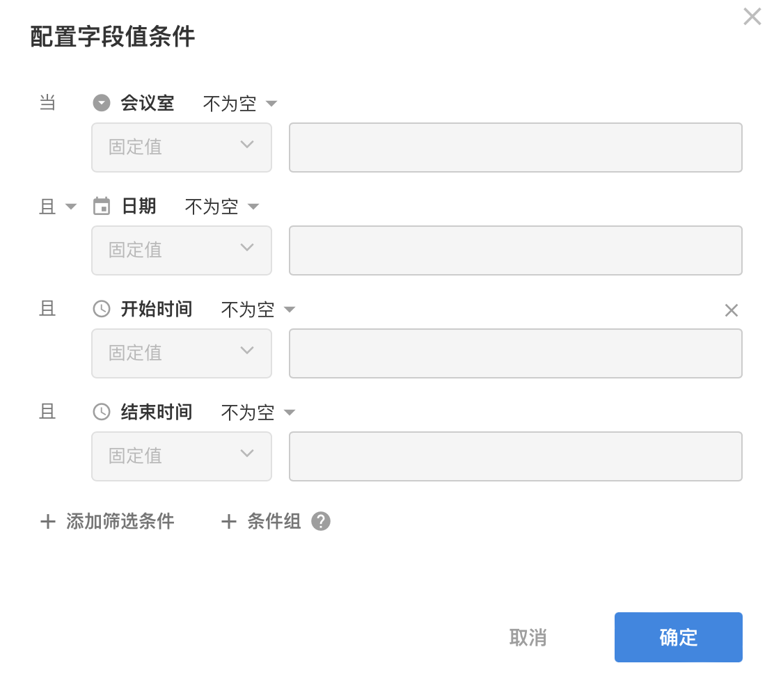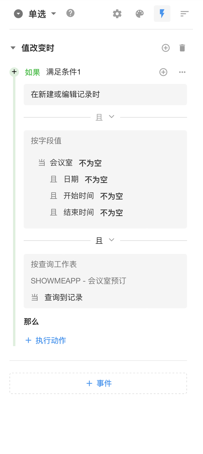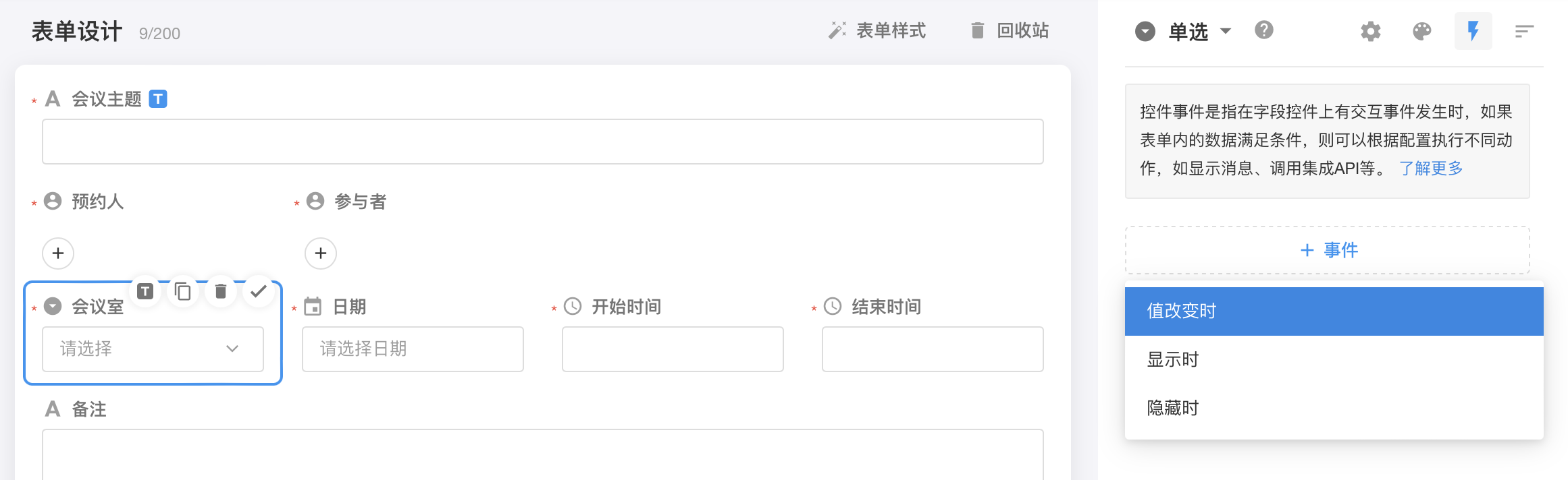 要实现上述效果,我们需要为“会议室”、“日期”、“开始时间”、“结束时间”4 个字段都添加相同的事件。