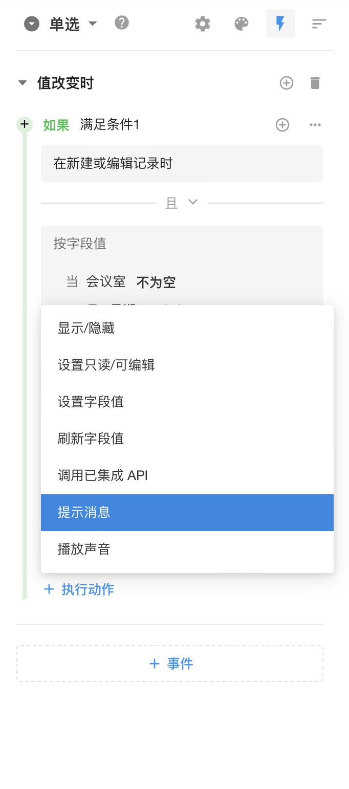 点击下方的“+ 执行动作”,添加一个“提示消息”的动作;