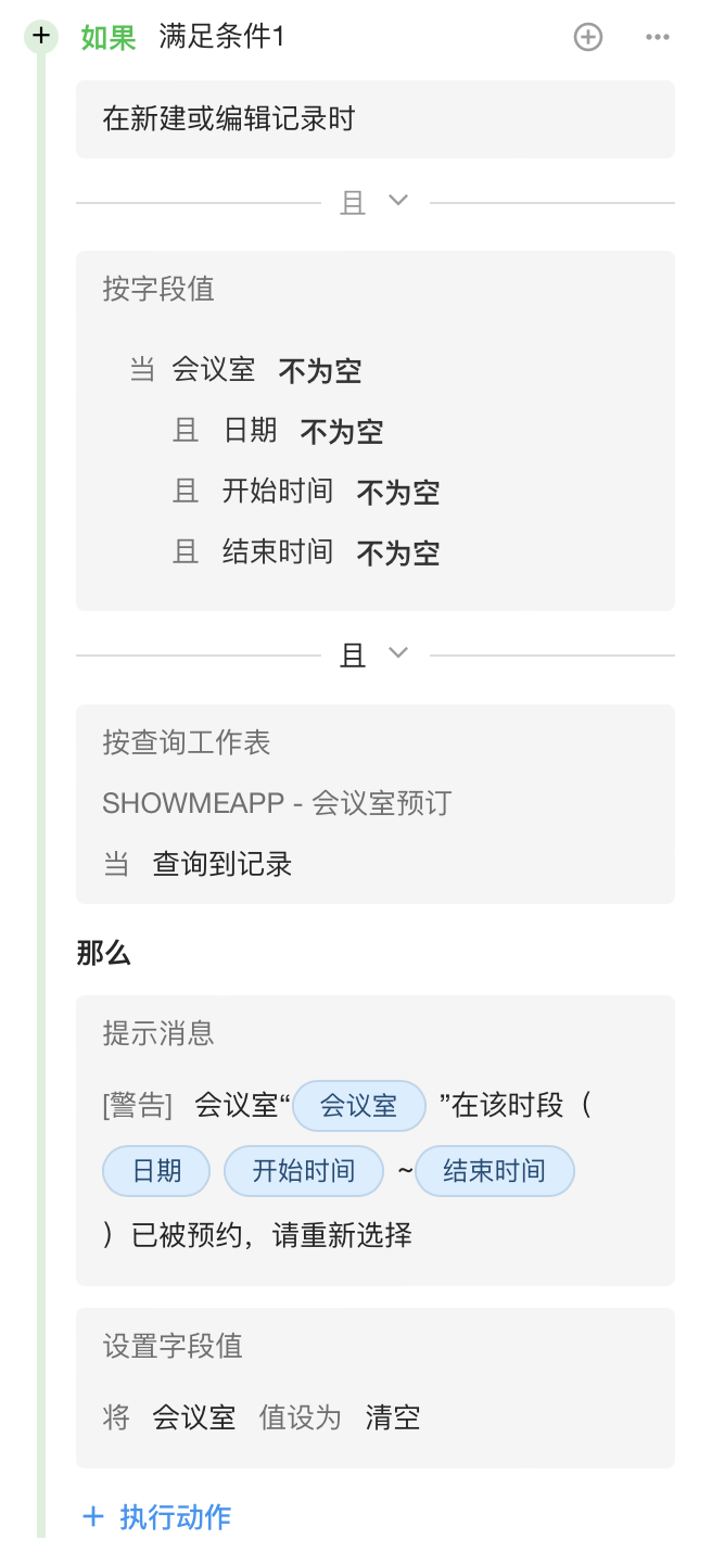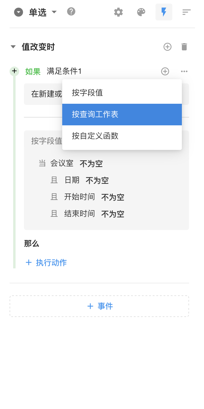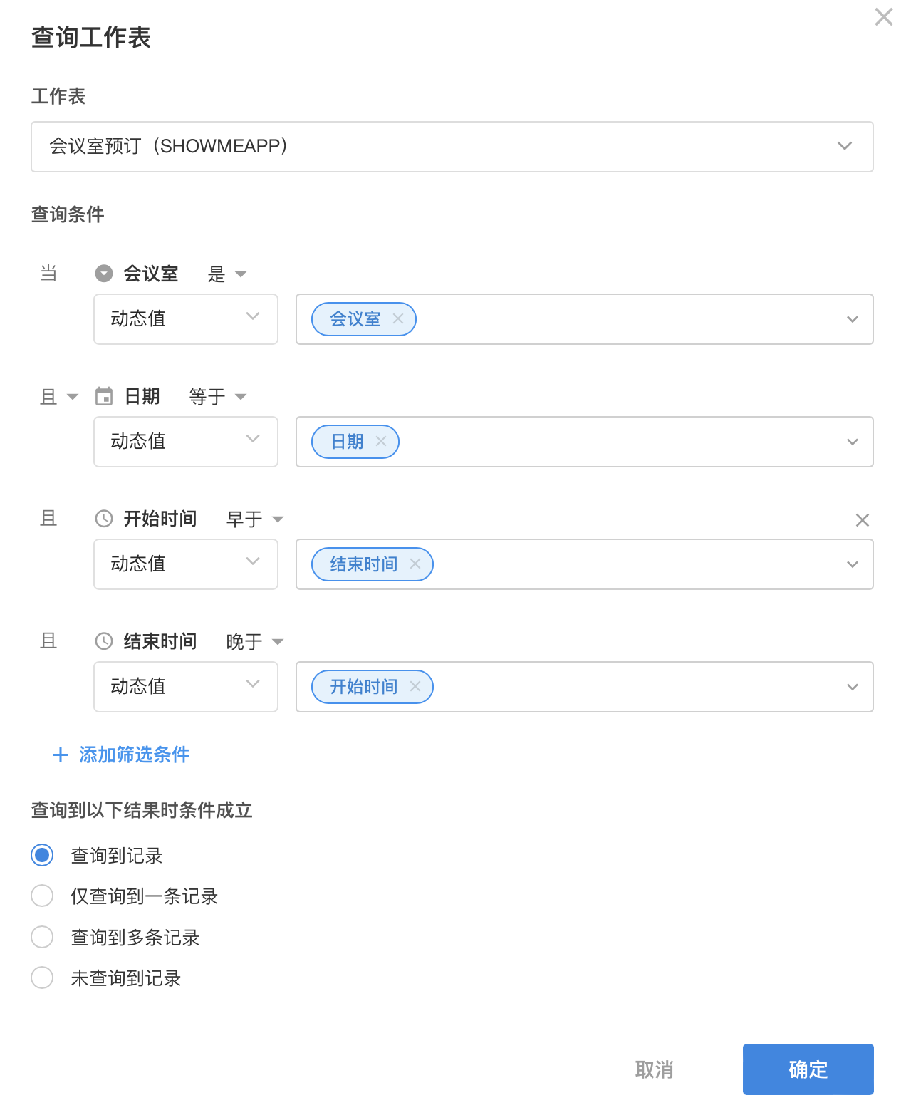 再添加一个“按查询工作表”的条件,这一步是校验在这个时段内是否已经有存在会议室预约记录: