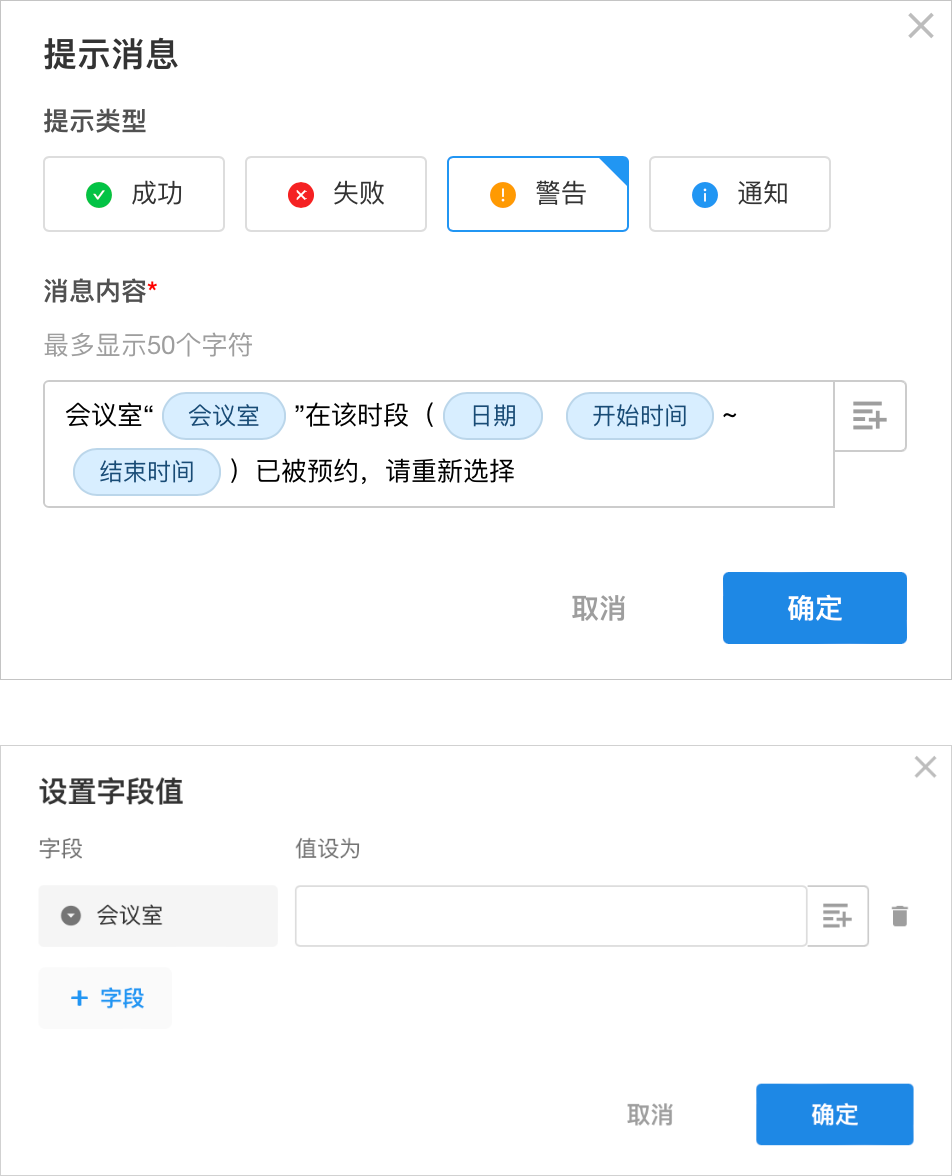 配置好事件保存后,当我们在创建或者编辑记录时,如果选择的会议室时间段不可用,则会弹出提示并清空我们输入的内容: