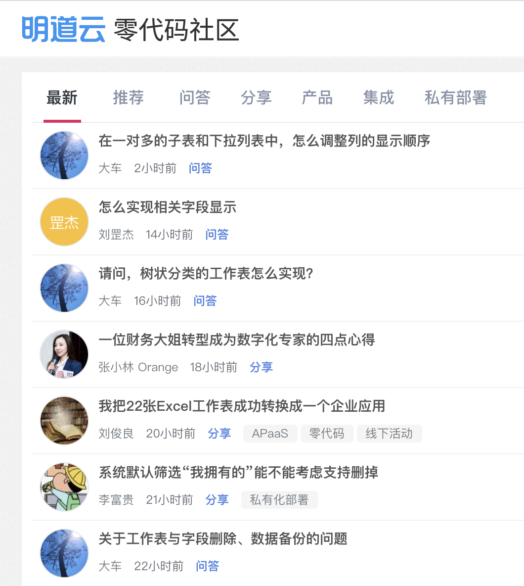 明道云零代码社区,一个极客云集、高手过招的宝地。零代码小白可以随时发帖,咨询技术问题。热心的极客总会乐于回应,并传授独特的应用搭建经验。