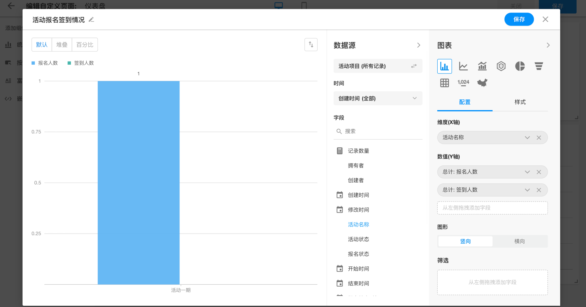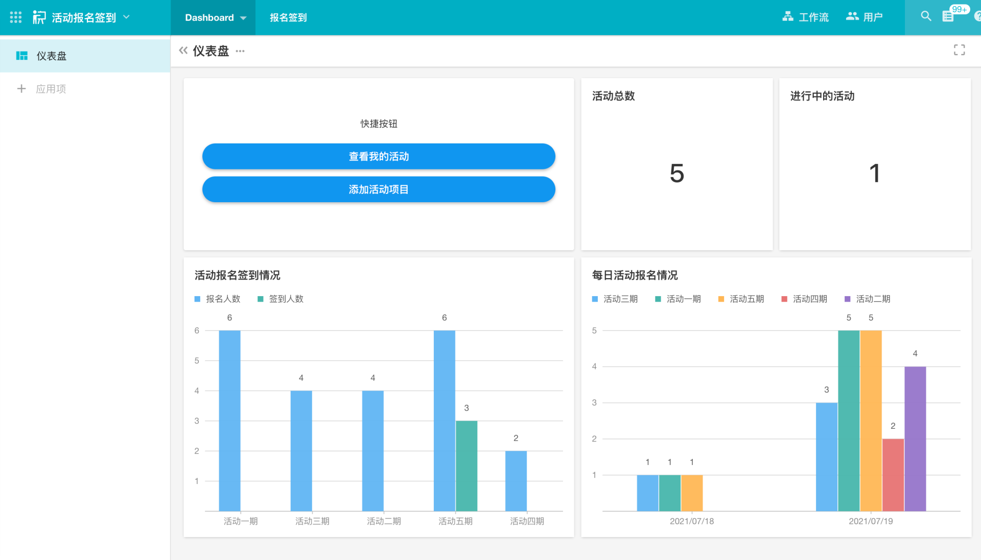 到这里,我们的活动报名签到后台应用就搭建完成啦。可以发放二维码或者链接到对应的渠道,实现报名和签到信息的收集。同时,后台也可以对数据进行自定义统计分析。