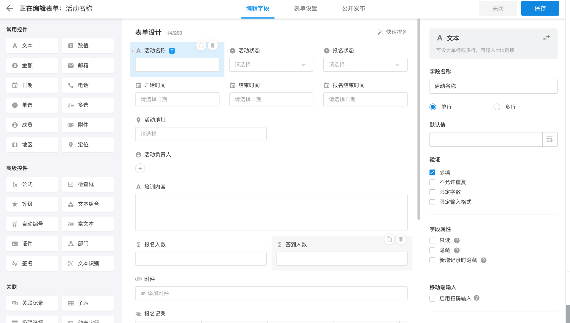活动需要的基础信息字段,并关联报名记录和签到记录。