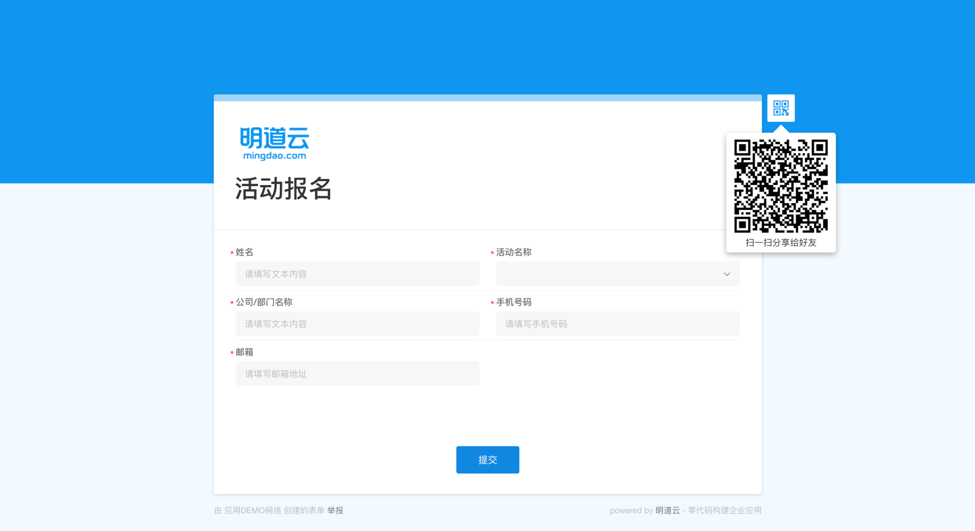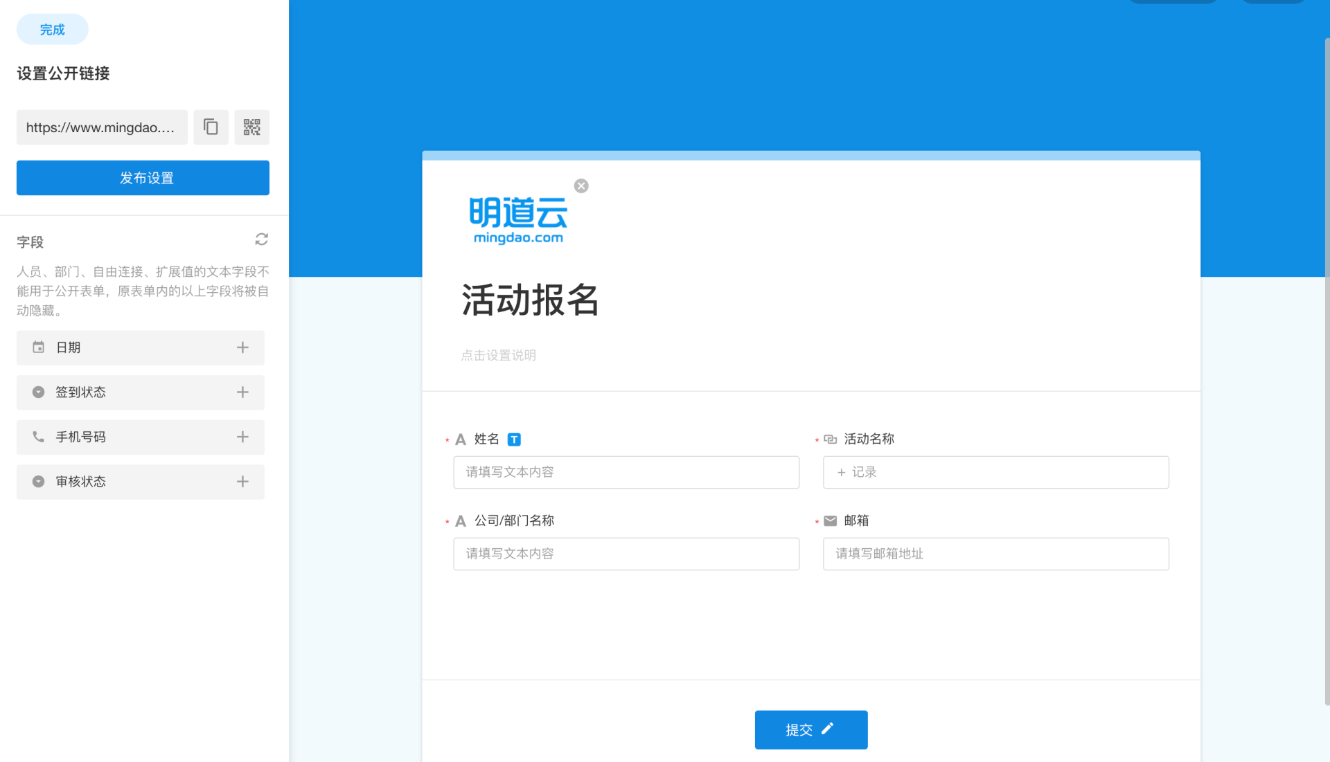 熟悉明道云的朋友们都知道,它可以搭建的应用五花八门,没有做不到的,只有想不到的。今天我们来介绍一款简单又实用的小应用,活动报名与签到。相信很多朋友都可以用上,小白用户也可以自己上手,搭建属于你的活动报名系统。明道云在其中的作用,主要是通过二维码或者链接的方式,实现用户报名和签到信息的收集及统计分析。