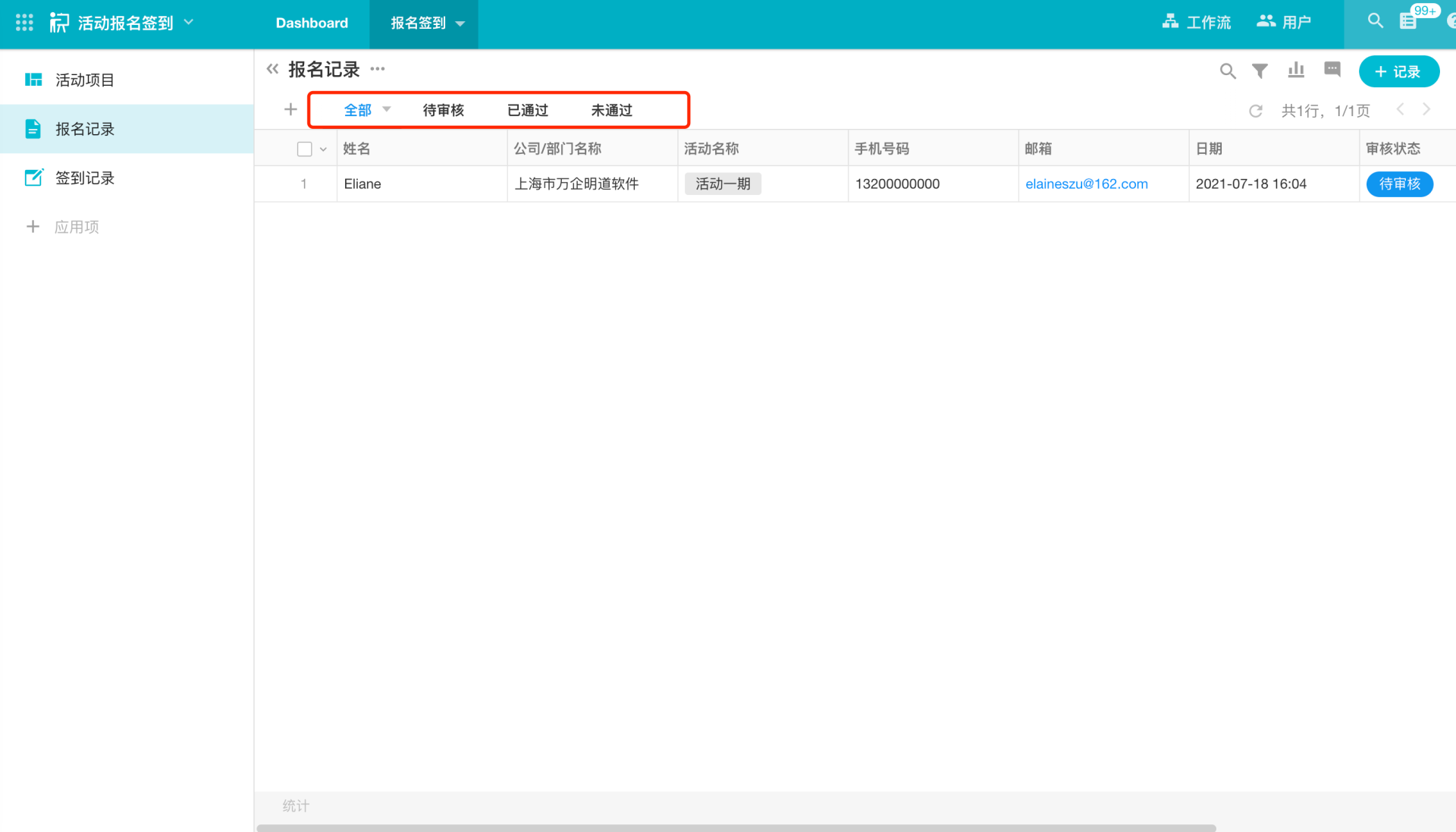 如报名记录,根据报名的审核状态,分别配置了“待审核”、“已通过”、“未通过”的视图,便于查看。