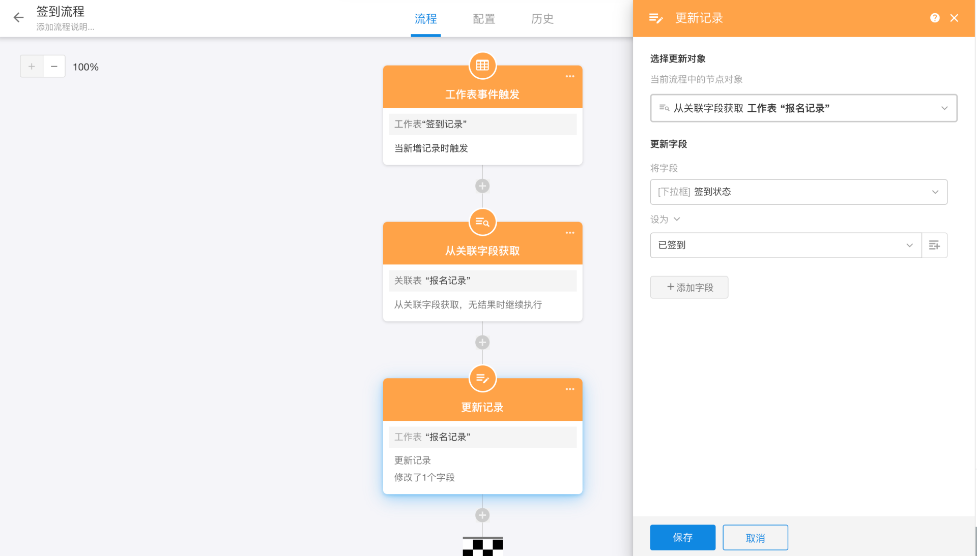活动正式开始签到后,新增签到记录,查找原有的报名记录标记为“已签到”。