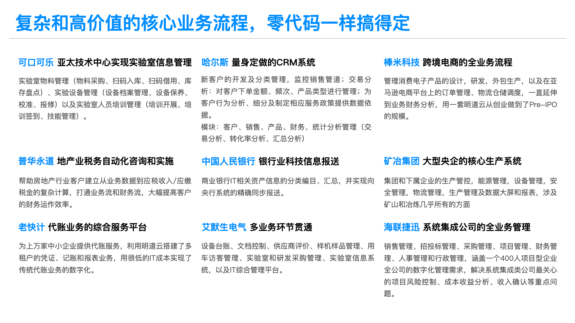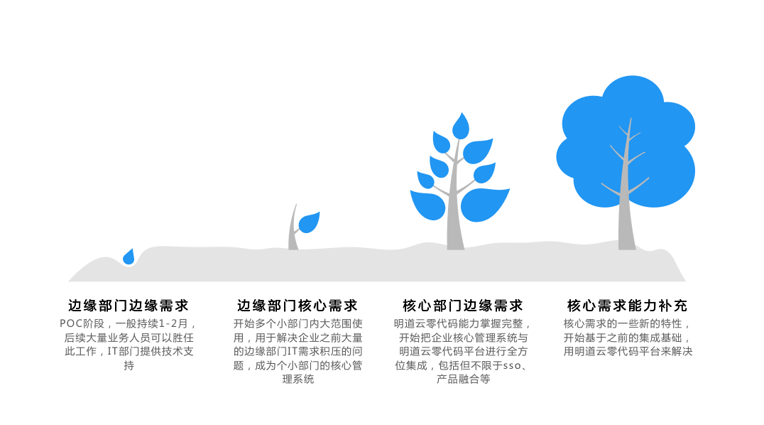 当然有些企业跳过了这个阶段,因为明道云在解决这类需求的时候,可能一两天就完成了从需求整理到上线的使用的的过程,得益于我们把之前企业中后台管理系统中大量的重复代码抽象成了我们产品内的控件,百倍级别地提高了开发和部署的效率。本质上,支撑部门的需求和核心部门的需求,在难度上没有太大的区别,只是之前的 IT 建设优先级比较低,在经过验证后,企业很乐意继续往更加核心的板块开始推行使用零代码来建设。