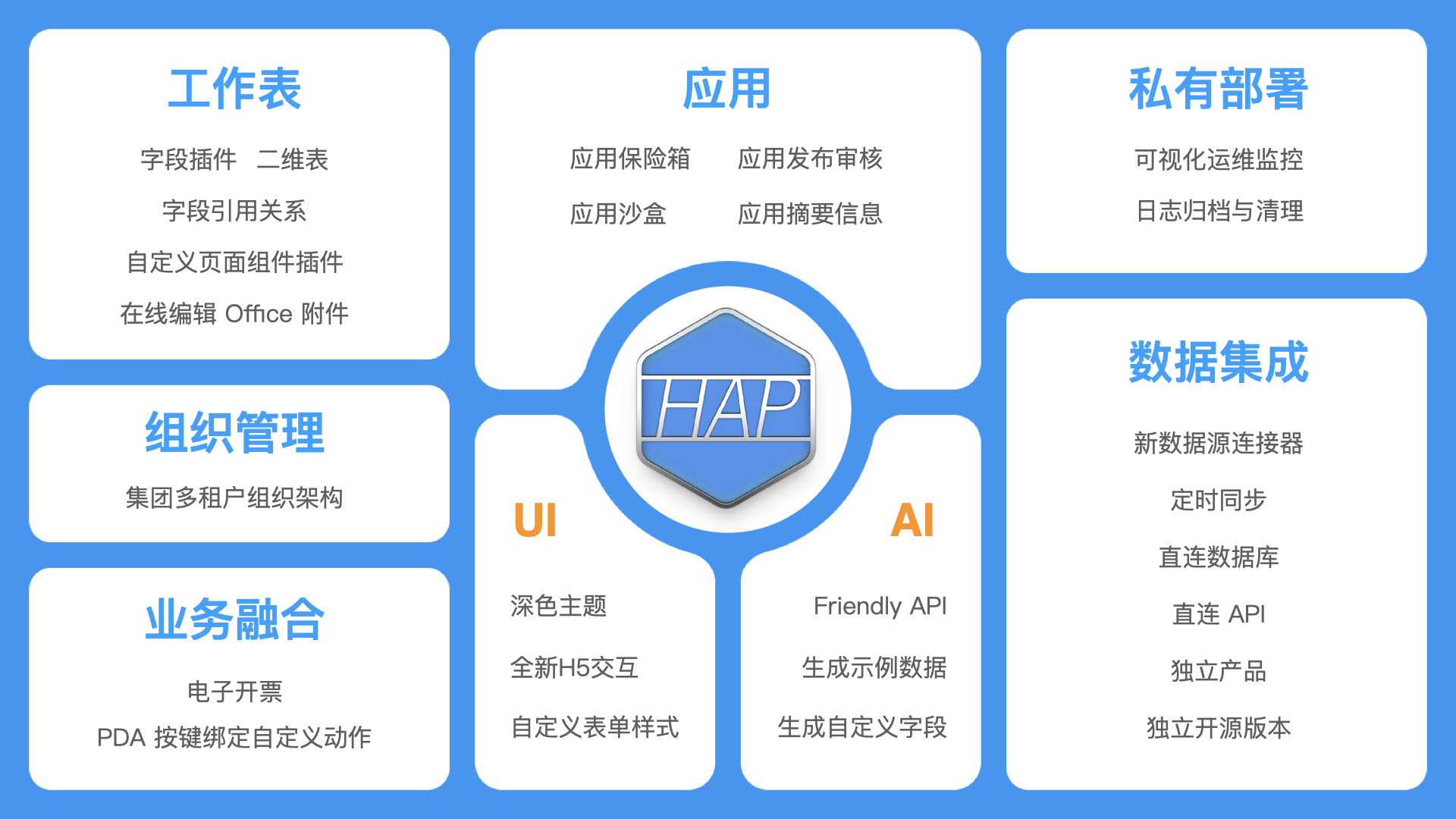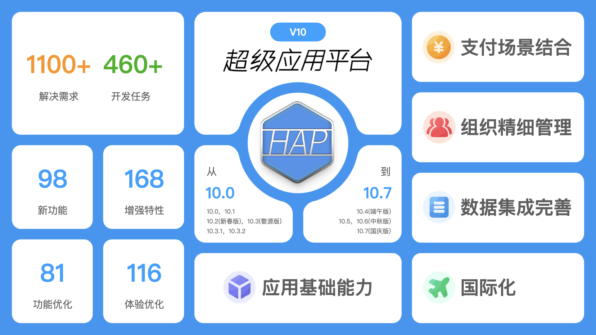 明道云 CPO 薛宗铭总结了过去一年以来 HAP 在产品研发上的成果。从去年 10 月份 HAP V10 发布至今,V10.x 系列版本共经历了 7 次版本发布,推出 98 个新功能和 168 个增强特性,解决超过 1100 个需求。应用基础能力加强、支付场景结合、组织精细管理、数据集成完善、产品国际化,是今年明道云 HAP 产研团队的发力重点。