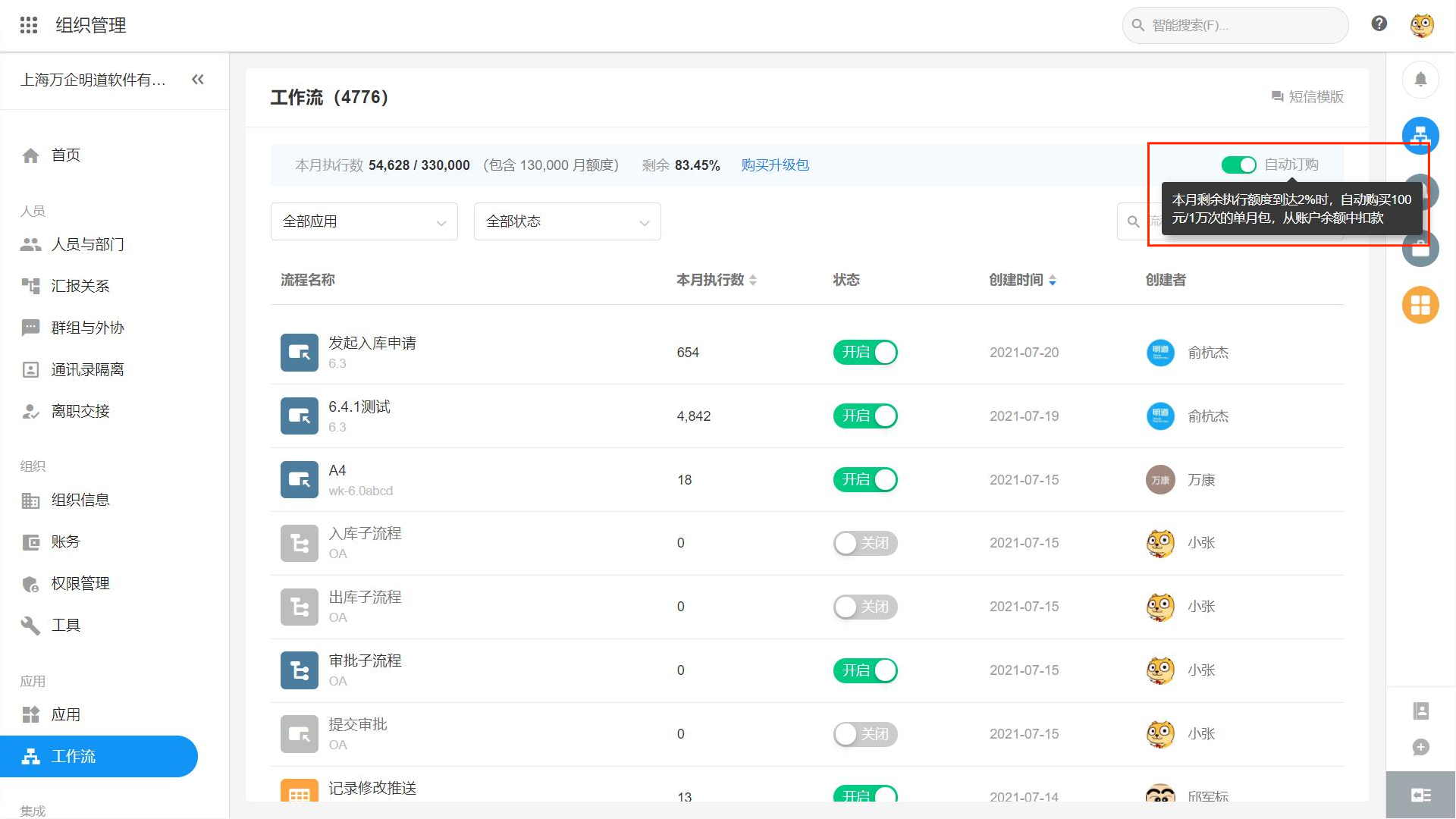 开启此项功能后,当月剩余执行额度为 2% 时,自动购买 100 元/1 万次的单月包,从账户余额中扣款。