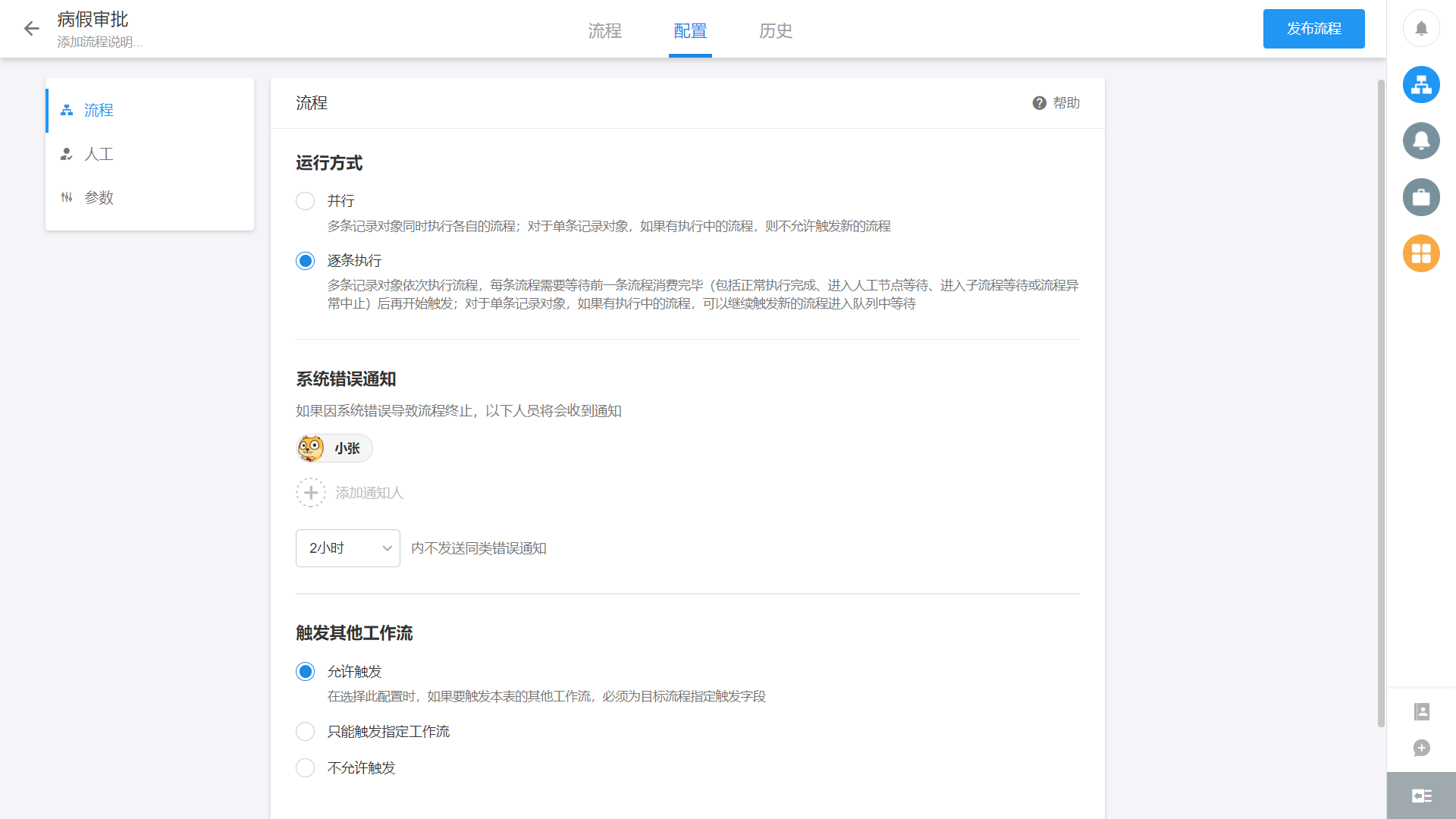 自定义按钮触发、工作表事件触发(仅新增记录、删除记录时)的流程支持设置运行方式:并行、逐条执行。