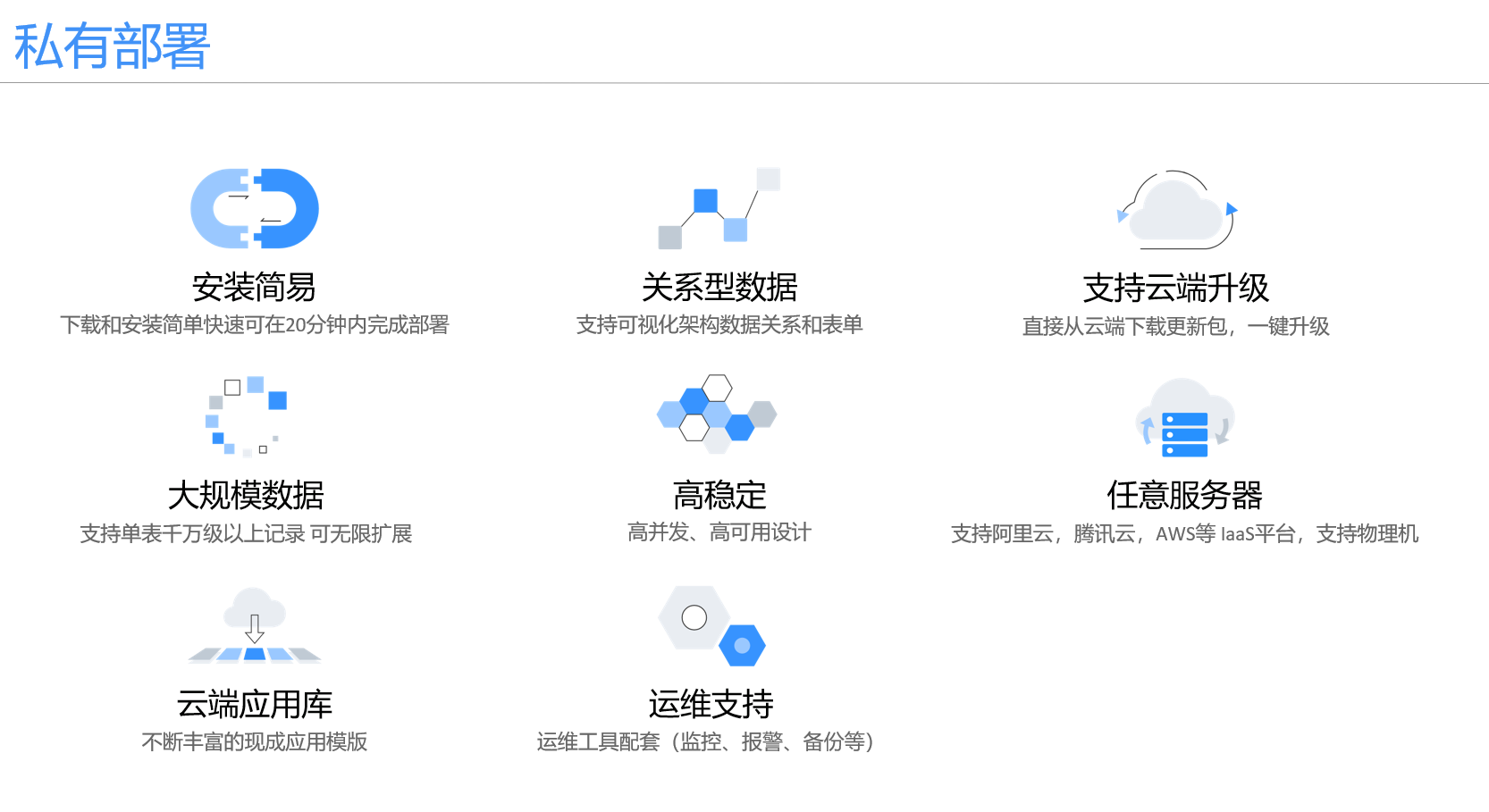 除了产品使用层面的易用性之外,明道云的私有部署方式也是简易快速,通过 docker 镜像方式可以实现快速部署,不到半小时就可以有一套自己的私有化明道云环境。