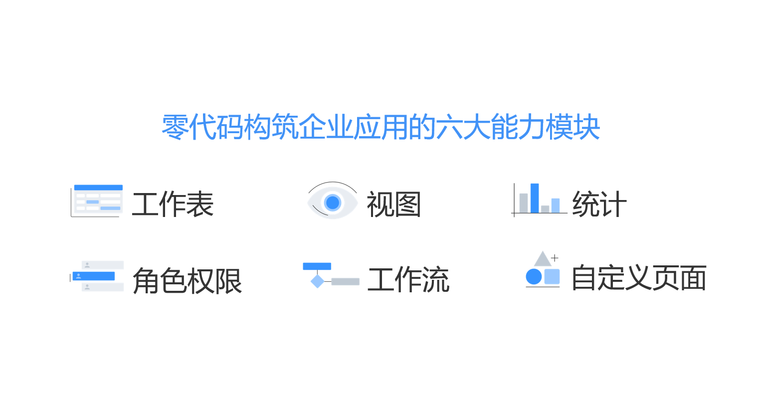 对于目前市面上的零代码产品来讲,产品的基础功能点基本都大同小异,无外乎是:工作表、视图、工作流、角色权限、统计图表等功能点。其实对于具体的场景需求而言,每家的产品通过基础的能力基本都是可以搭建实现出来的,只不过是逻辑方式以及实现起来的复杂度不同而已。