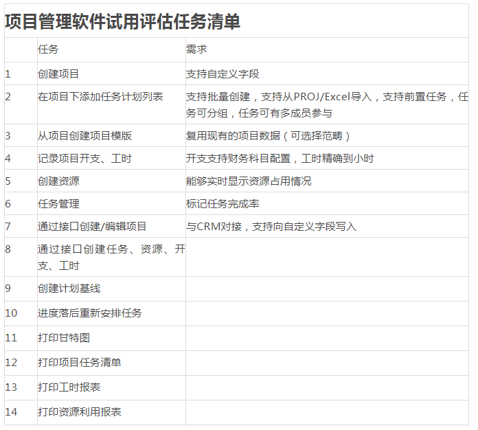 不同的试用项目必然配套了不一样的任务清单,任务清单不需要贴合厂商产品的特性清单,它只需要完全根据企业自己的需求来设计即可。对于多部门共同参与使用的软件,还需要和相关的部门使用者确认这个清单的完整性,验证他们的关键任务需求都能够得到体现。