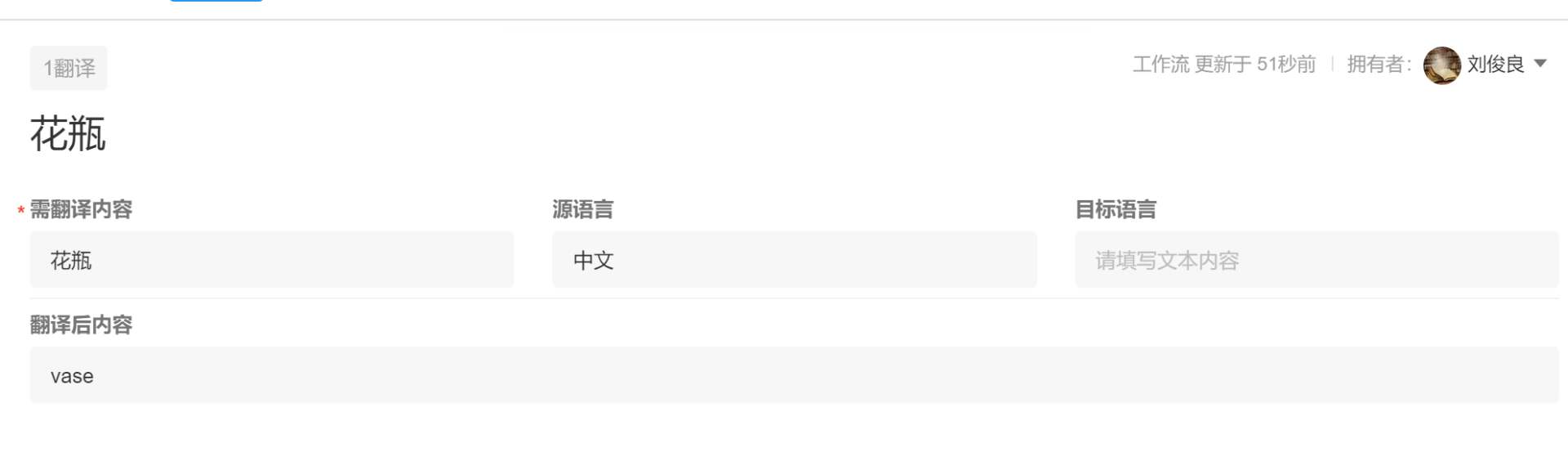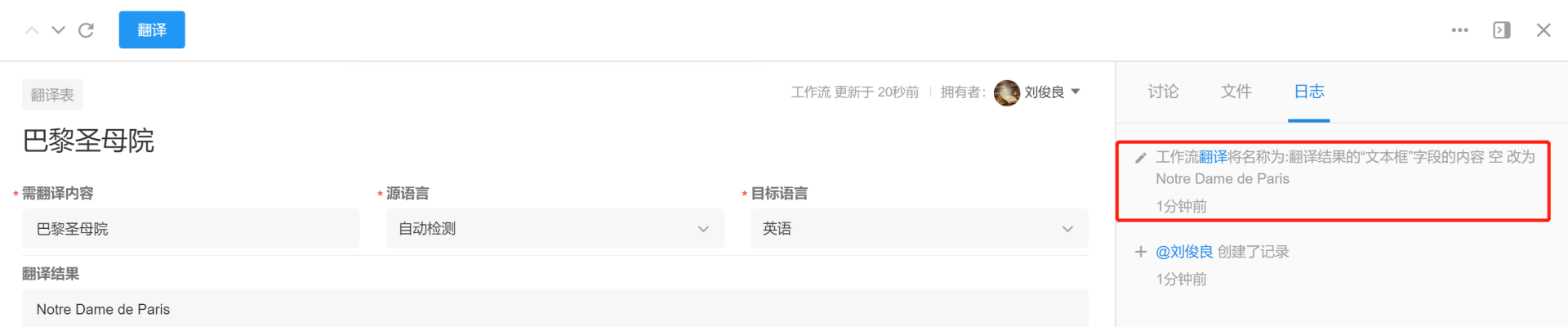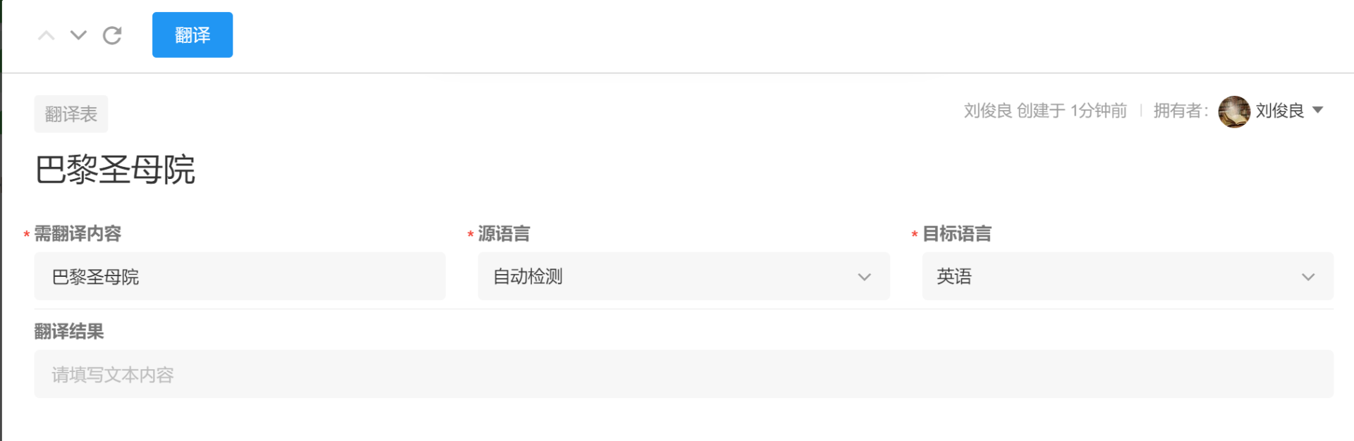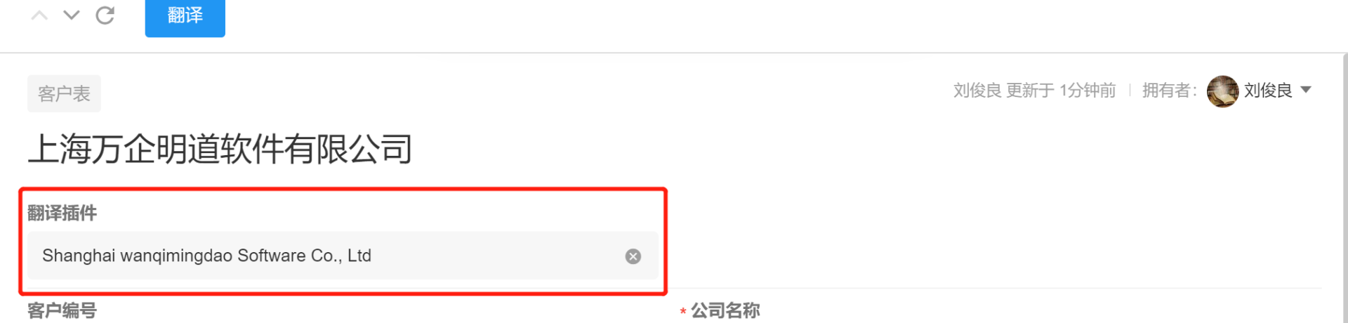 那么在目标工作表的记录中,就多了一个翻译插件的字段,我们只需将这条记录内需要翻译的内容,复制下来,并粘贴填写进翻译插件字段内,就会得到翻译的结果了。