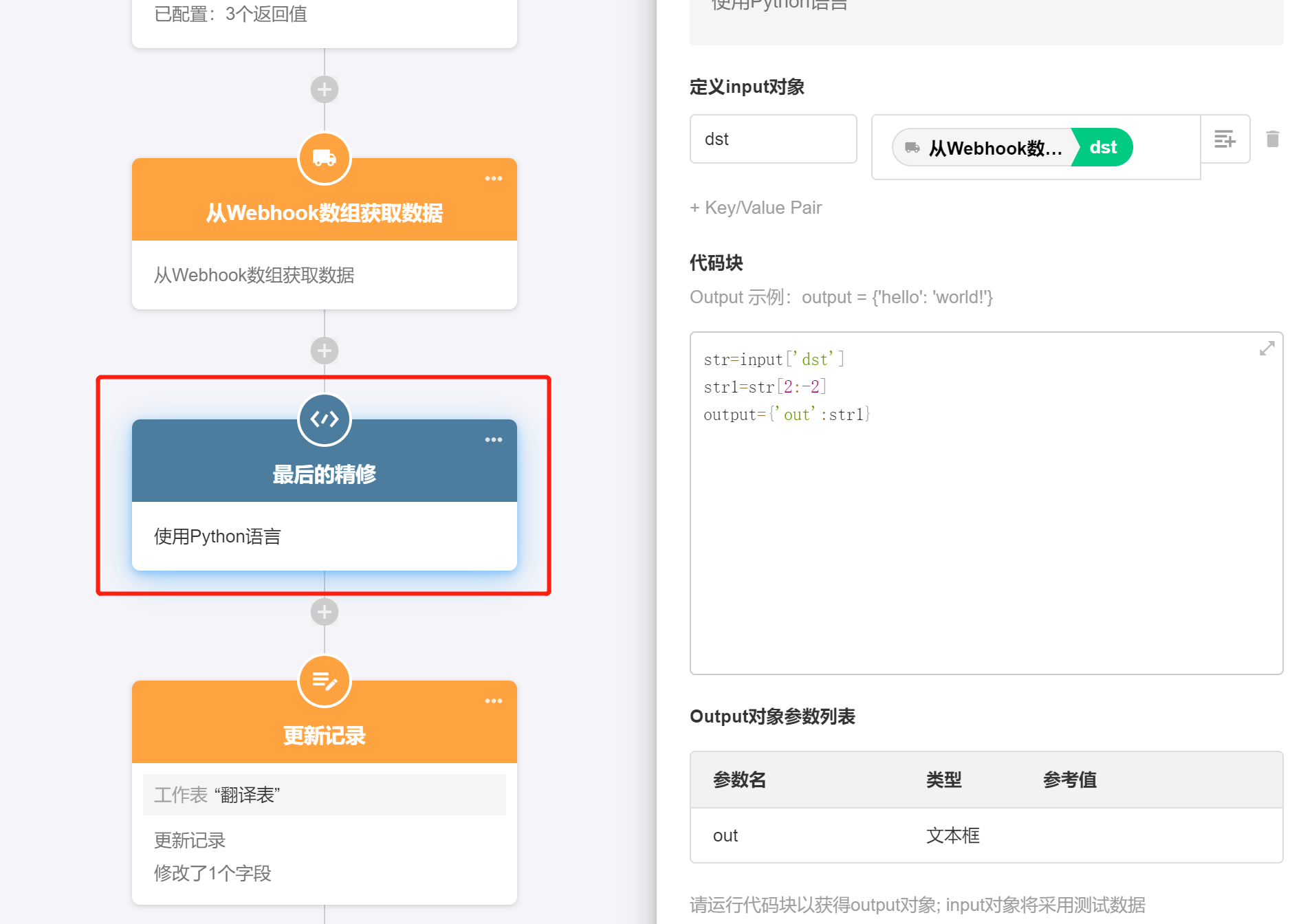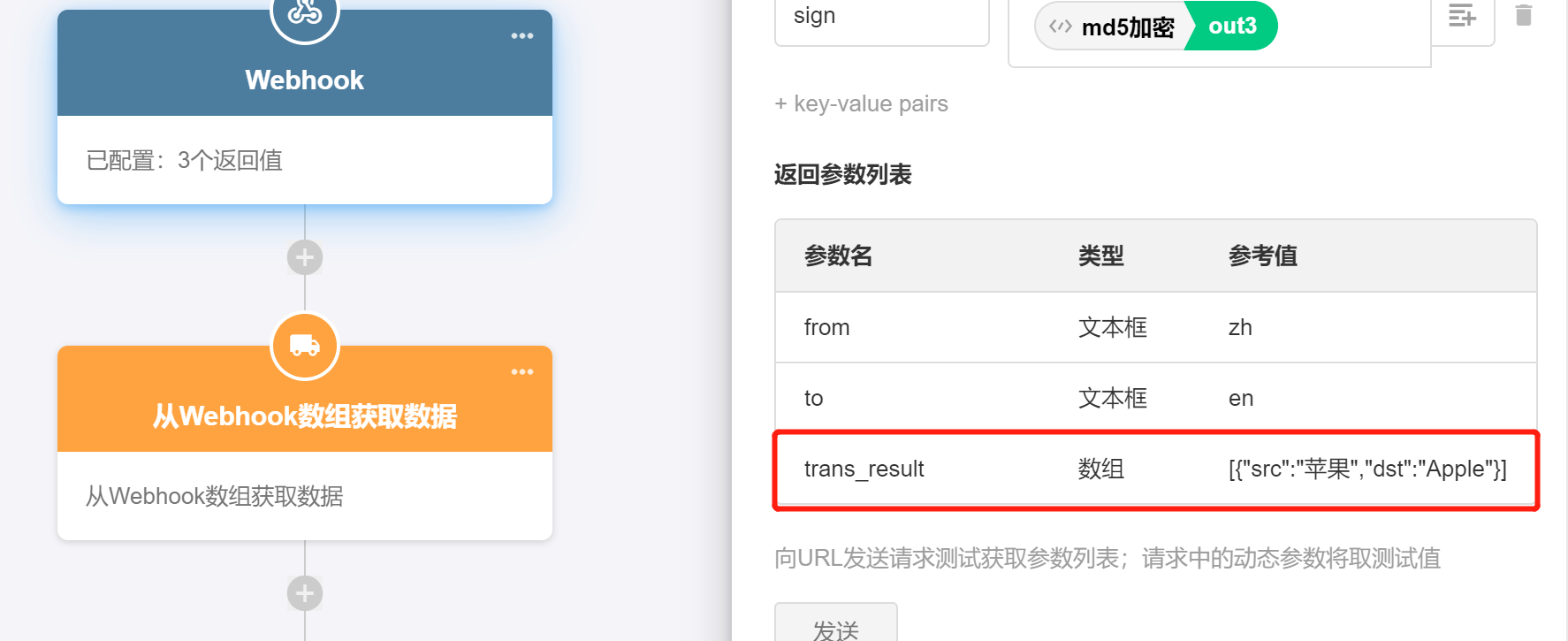 在完成以上配置后,我终于接近了终点。在 webhook 节点中,配置好发送请求的地址,以及各个参数的准确值,我进行了一次请求测试,结果没有让人失望。