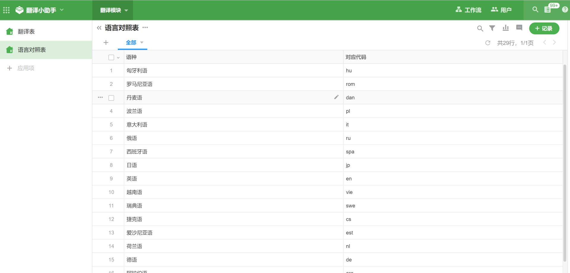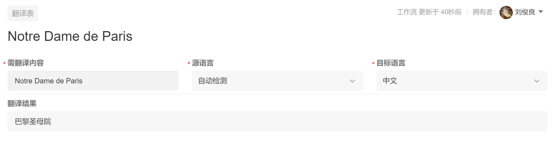 完成了工作表的构建以及工作流的配置,似乎应用已经顺利完成,不过还需要对我预设的功能进行一个测试,主要包括:是否具备翻译功能,是否具备任意语言的互相翻译功能。