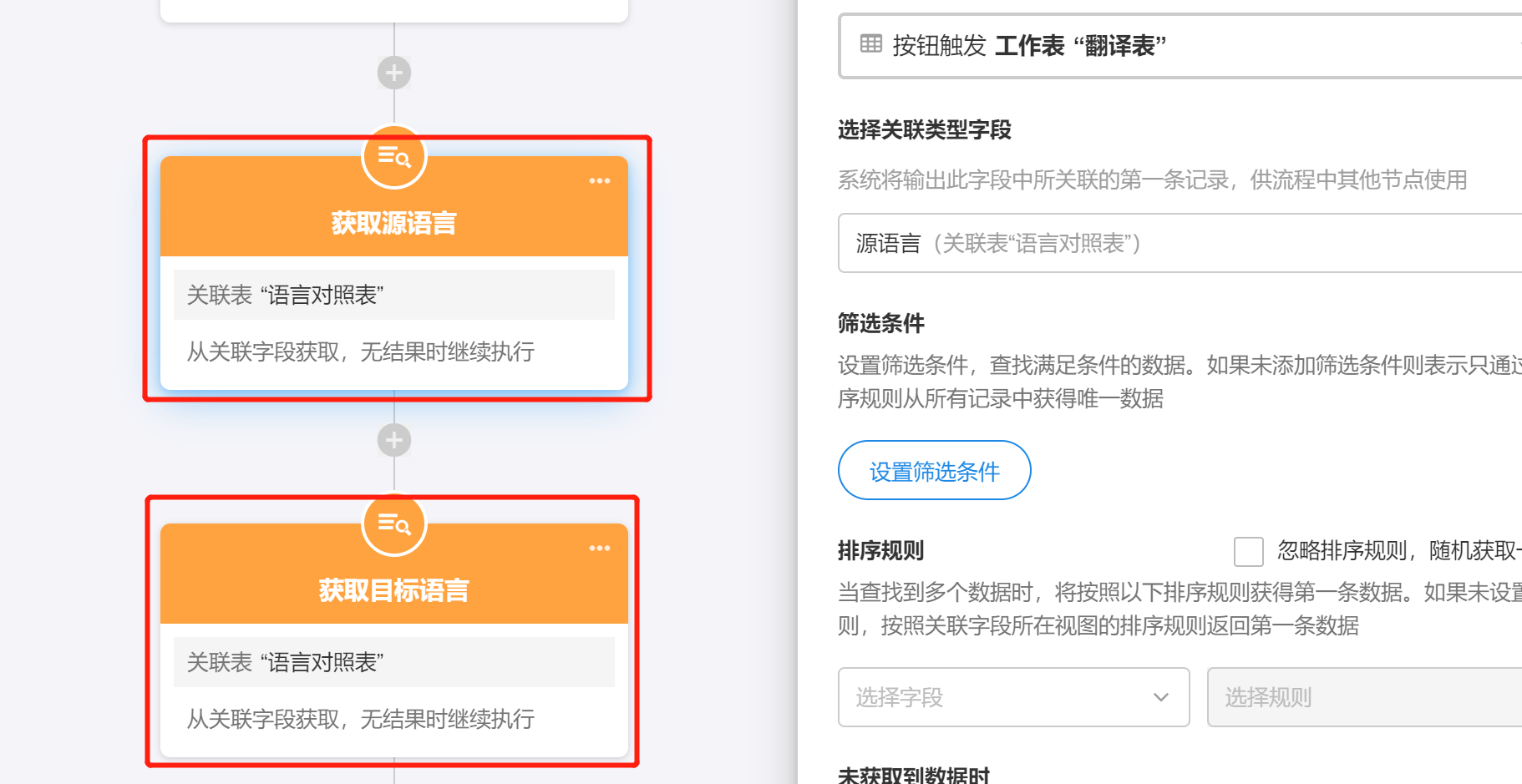 第三步便是通过明道云的 webhook 节点,发送请求并返回翻译的结果。这一步一共需要发送 6 个参数,依次是 q(请求的翻译内容)、from(源语言)、to(目标语言)、appid、salt 以及生成的签名 sign。我在这一步出现了一些问题,from 和 to 需要按照翻译规定的代码来填写,因此根据 API 文档中提供的语言代码对照表,在应用内同步地做了一张语言对照表,并与翻译表建立了关联关系,同时在工作流最开始的节点中加入了获取 from 和 to 对应语言代码的节点。