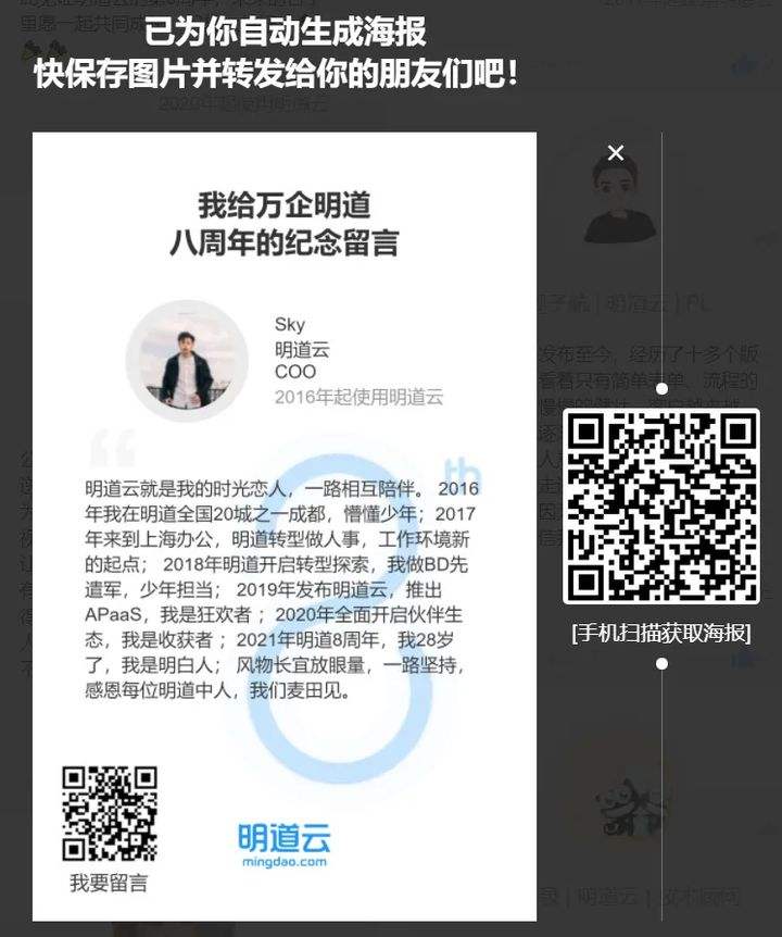 - 首先,您可以在电脑上输入网址(https://weixin.mingdao.com/8th)或手机扫码进入八周年留言墙页面。