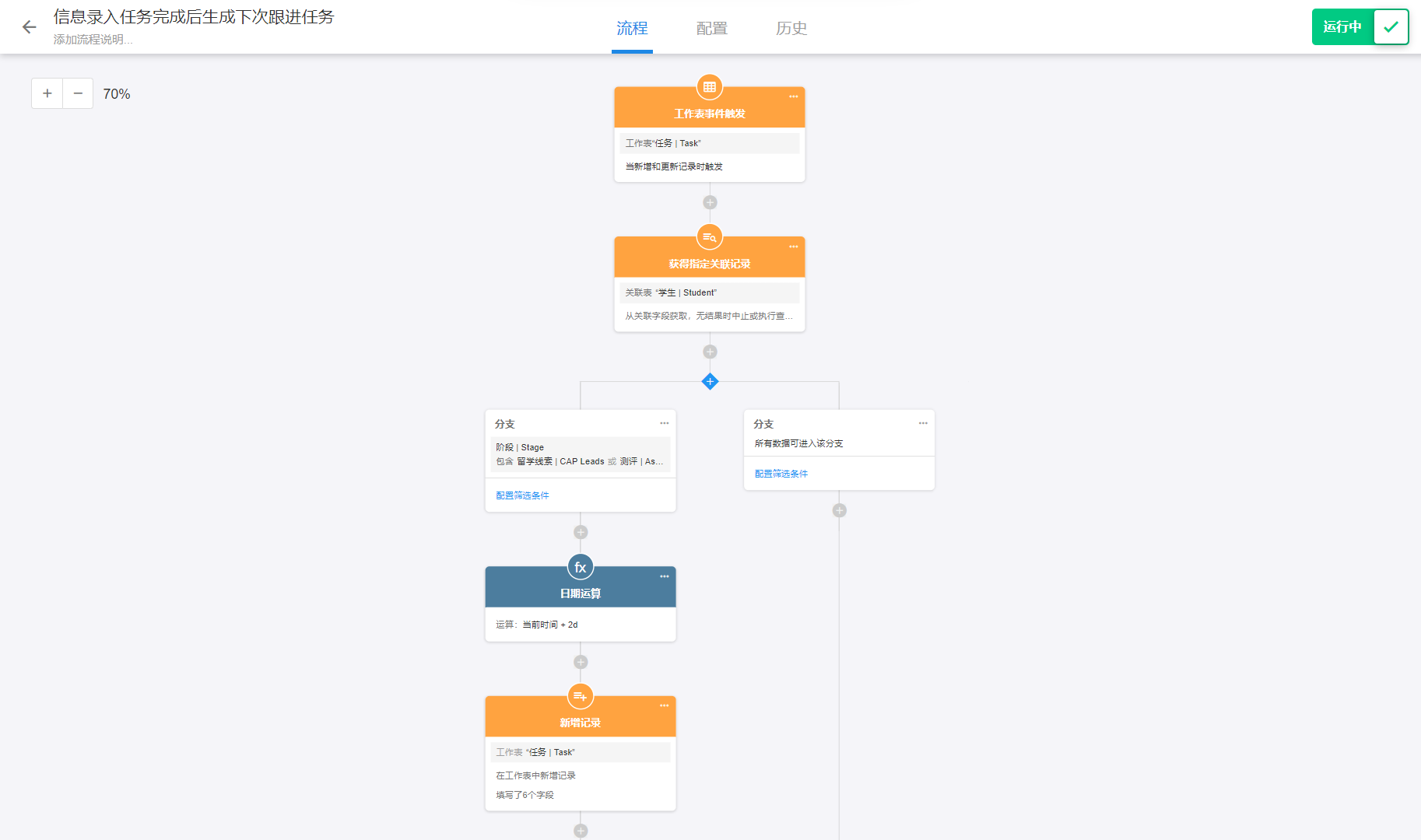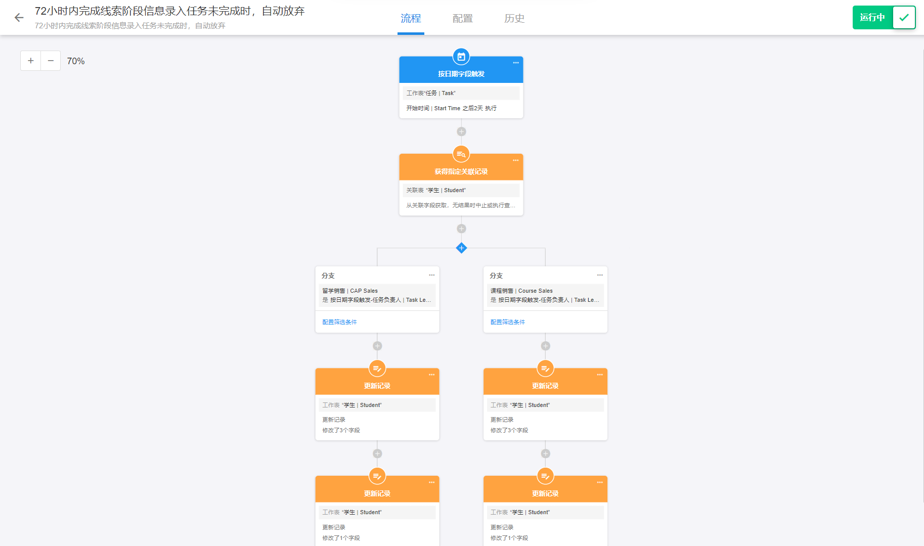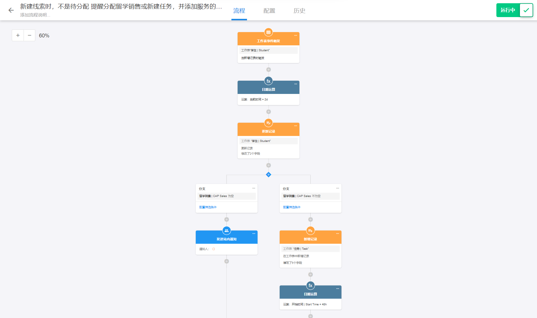 任务:任务也是贯穿整个管理周期的元素,涉及客户的跟进提醒、签约后的收款提醒、服务开始后的各个服务环节提醒等等内容,而这些都是需要通过工作流添加各类触发条件以及分支判断等节点来实现的。