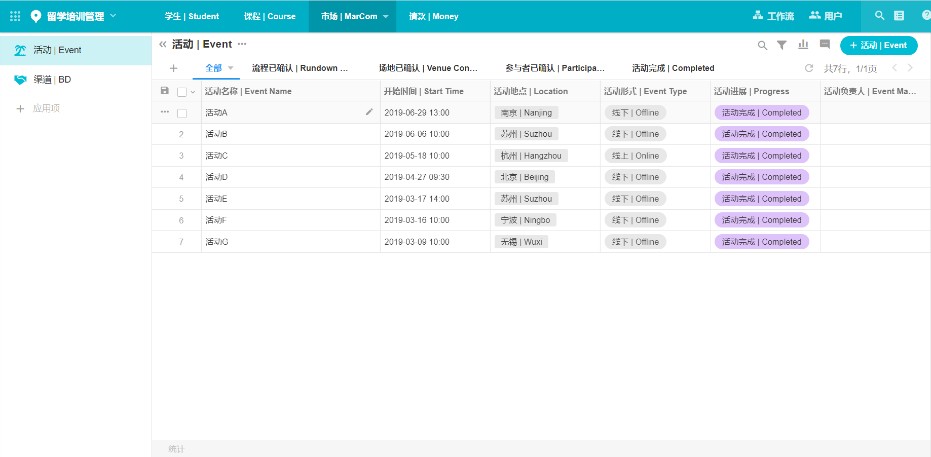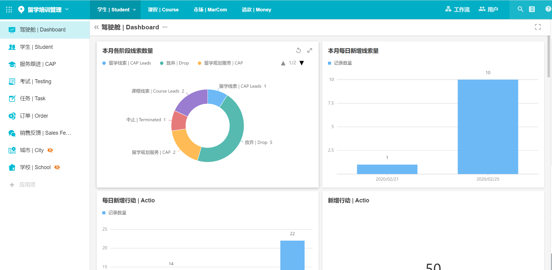 活动、渠道:此部分为订单的来源的部分管理,通过对市场部的活动以及合作渠道的管理,实现对学生来源以及转化的跟踪,判别哪种方式与模式更适合发展客户。