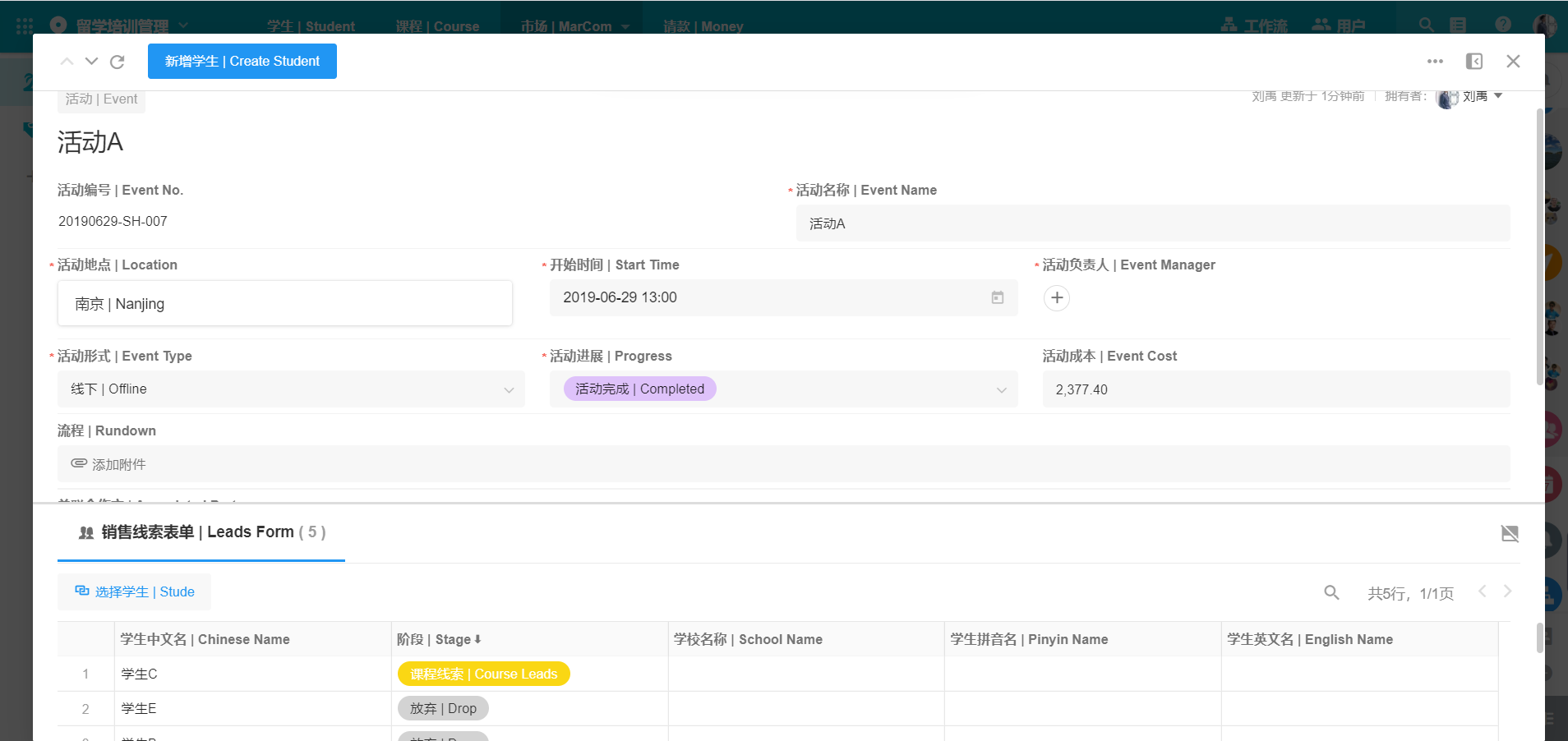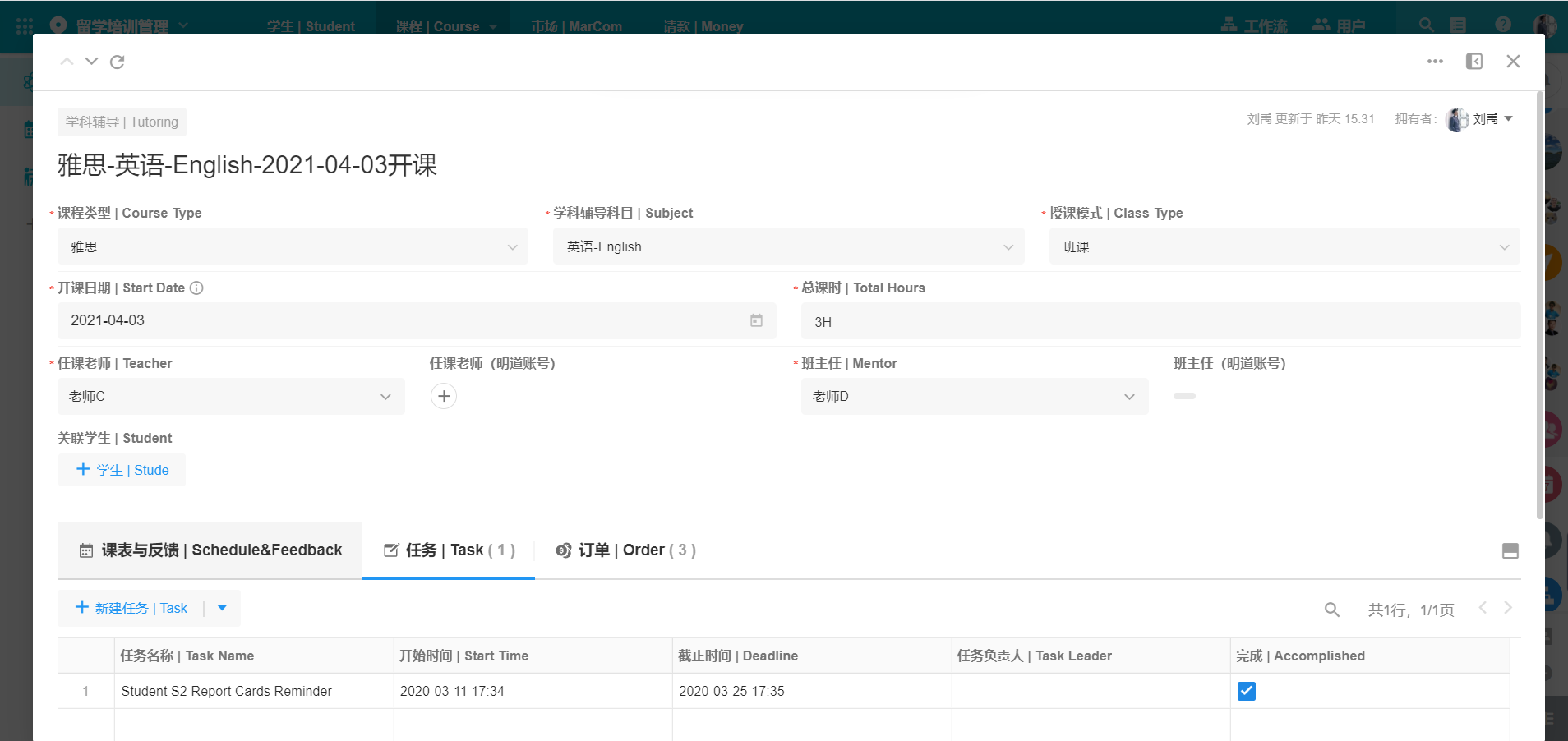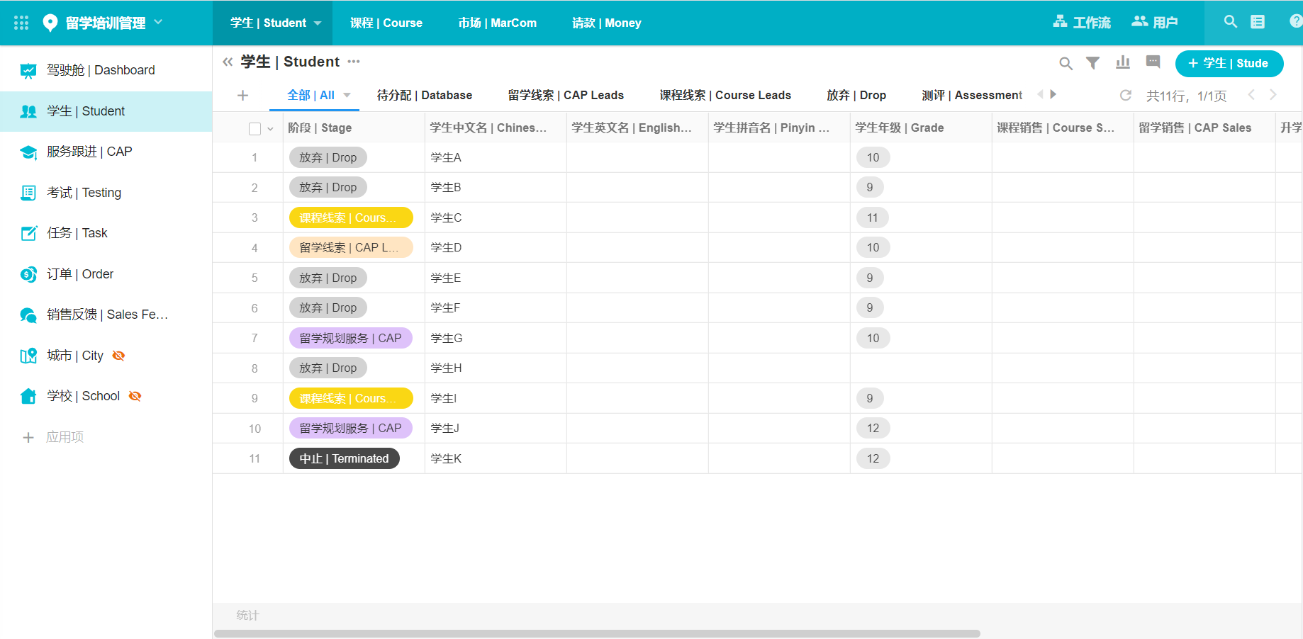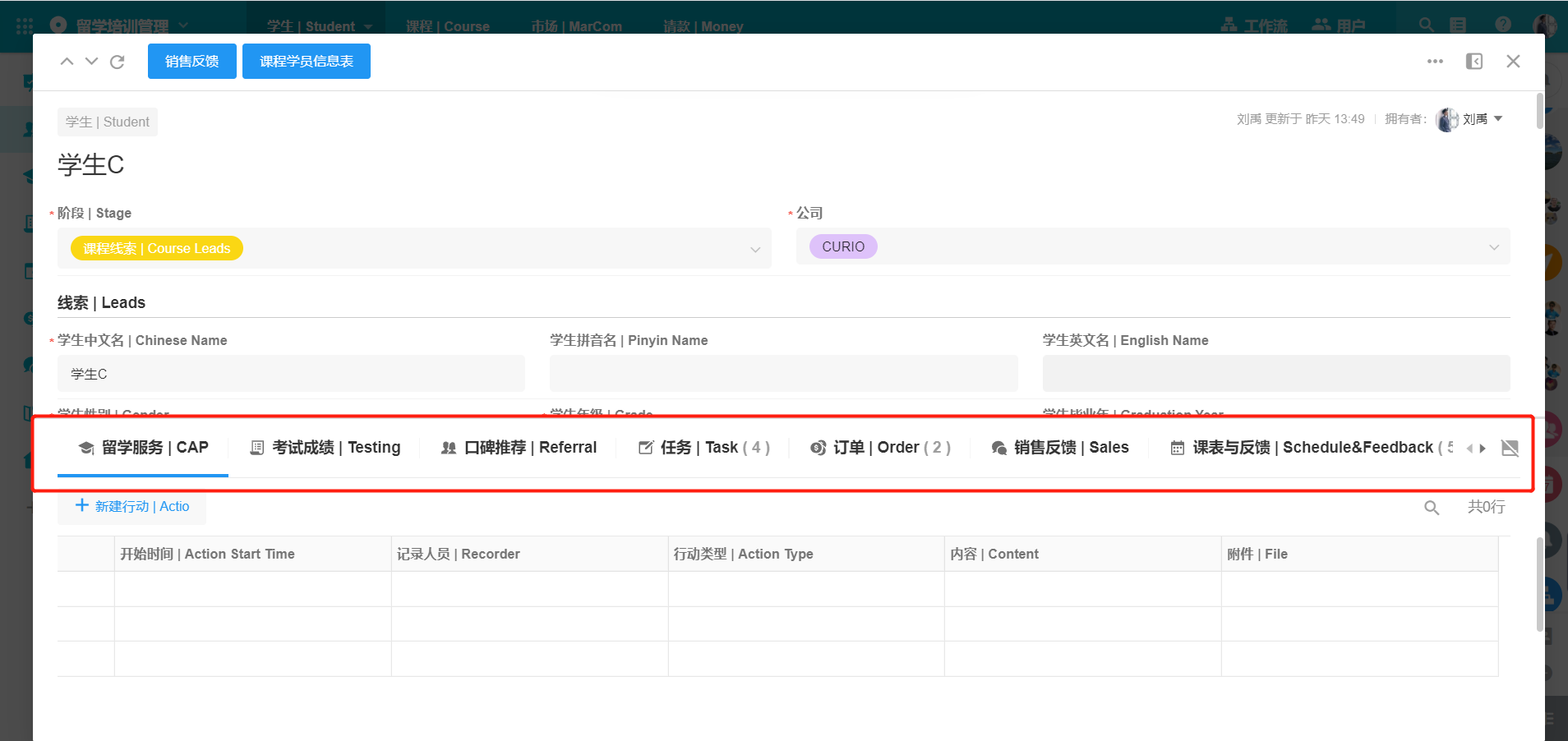 可以录入并查询到学生自身信息,以及也包含与之相关联的跟进、订单、任务、课程等信息。