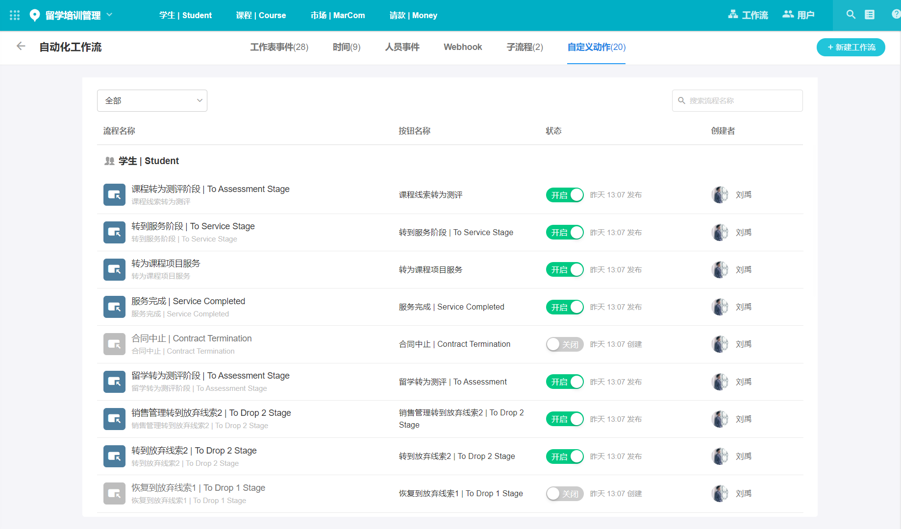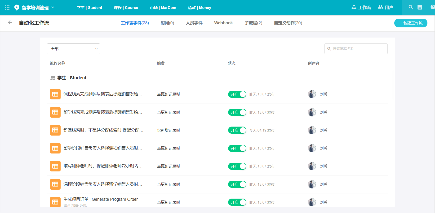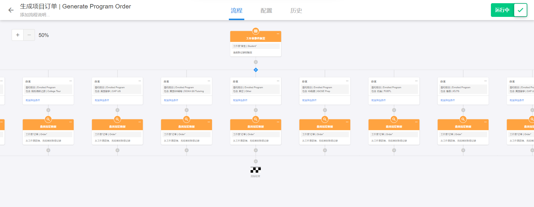 其他流程:除此之外包含各类定时触发流程用于任务、考试、上课、反馈等场景。以及很多辅助实现订单关联学生,课程关联订单等辅助类型的工作流配置。