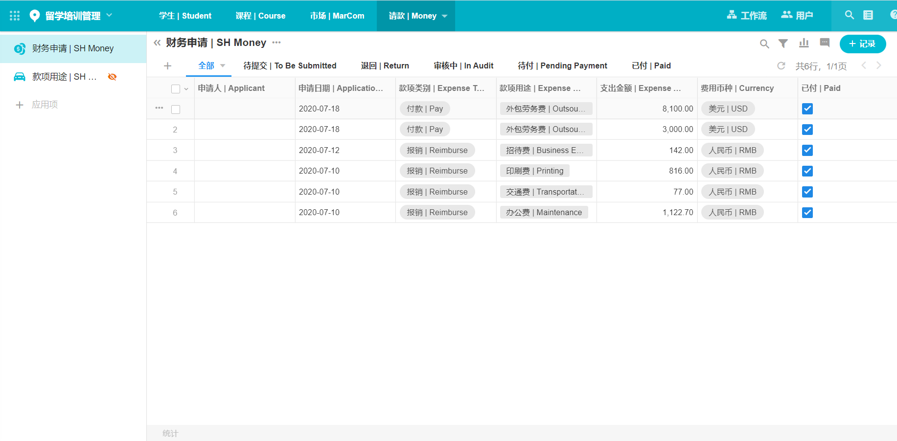 请款主要用于业务内部的付款报销场景,并且可以关联对应的活动、线索等,以便后续计算实际业务利润等,但不作为本期方案重点。