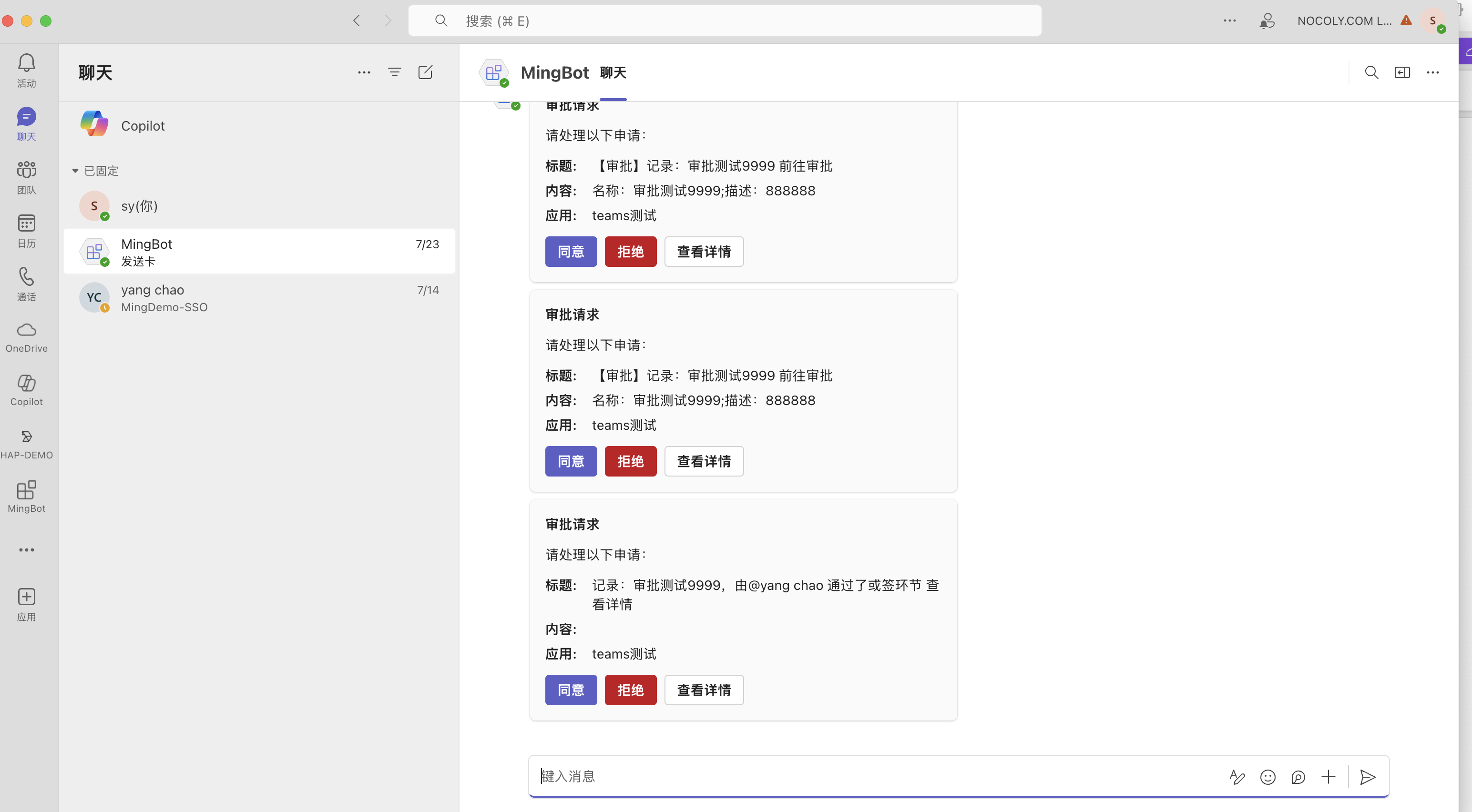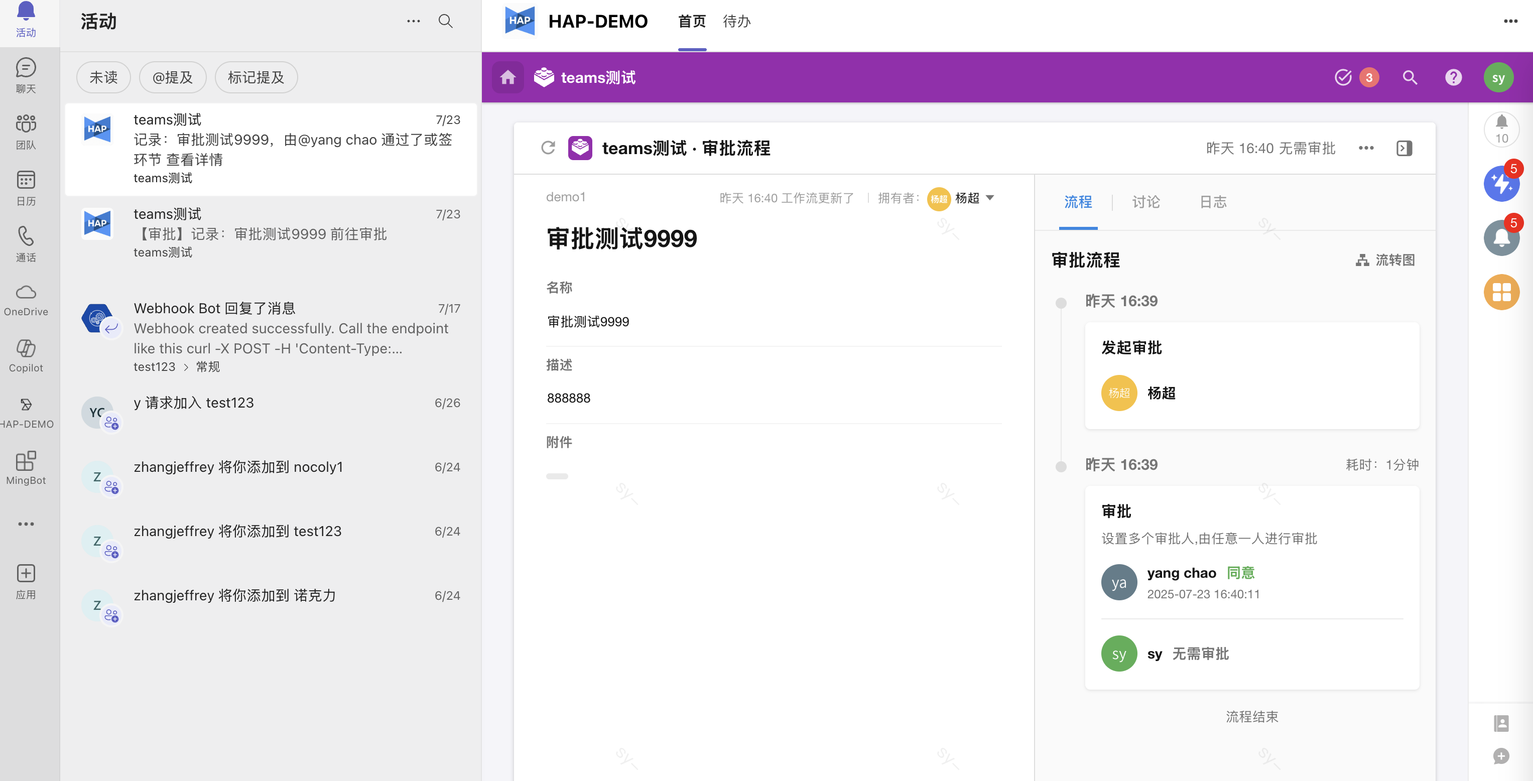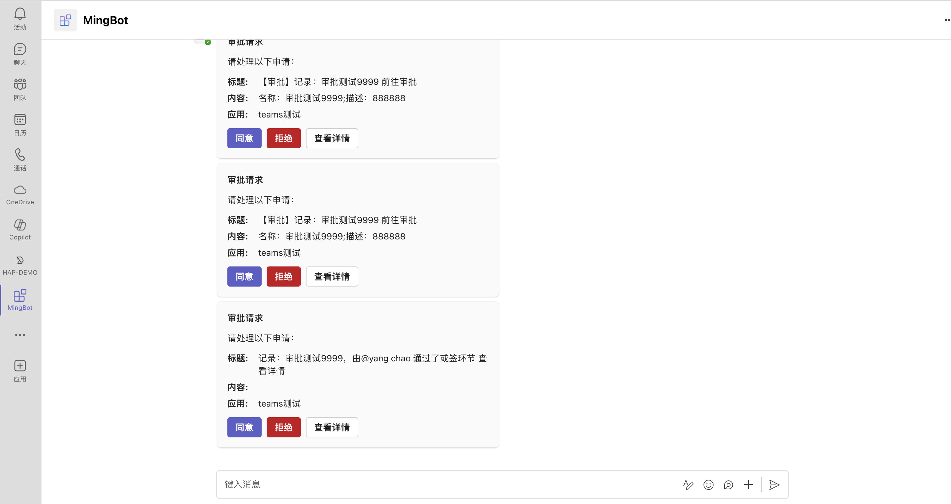 • 消息交互与操作:在机器人应用中,不仅能接收明道云的各类消息通知,还可直接完成相关操作。例如收到审批提醒时,可通过机器人预览审批详情,并直接进行 “通过”“驳回” 等操作,无需切换系统。