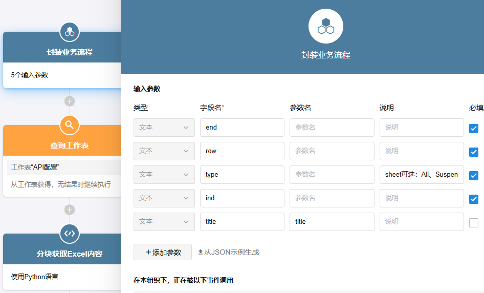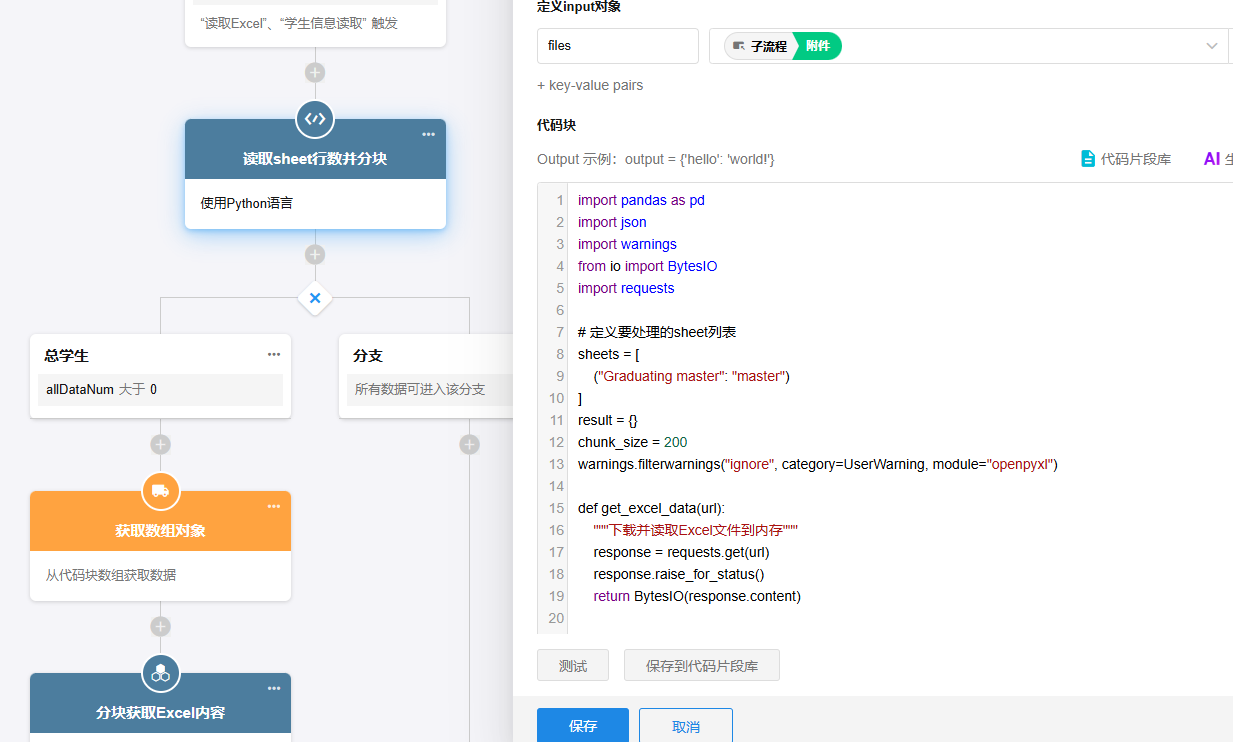 判断 total 是否大于 0;使用获取批量数据节点;获取分块数组;然后调用子流程--【分块读取内容】