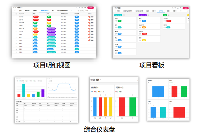 - 项目情况的图形化展示: 根据不同角色的权限和关心内容,包含 10 个项目明细视图,1 个项目看板,3 个综合仪表盘,便于各环节角色快速掌握现状。