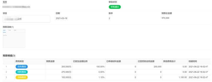 按照人、材、费分类别进行成本控制,后续发生的每一笔材料费用、劳务费用,其他费用(报销、水电等),都可以实时归结至项目各类别预算中,实时计算费用发生比例。