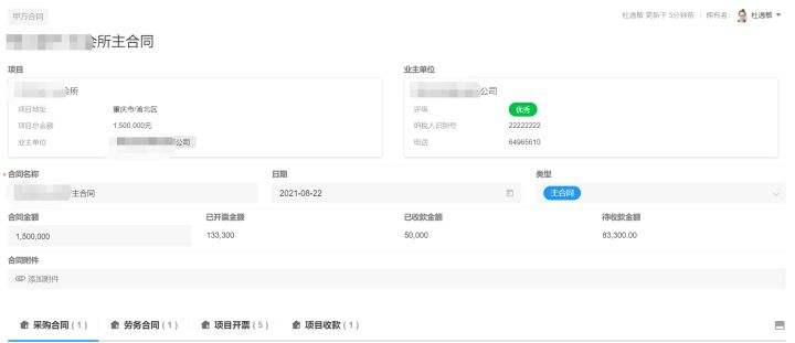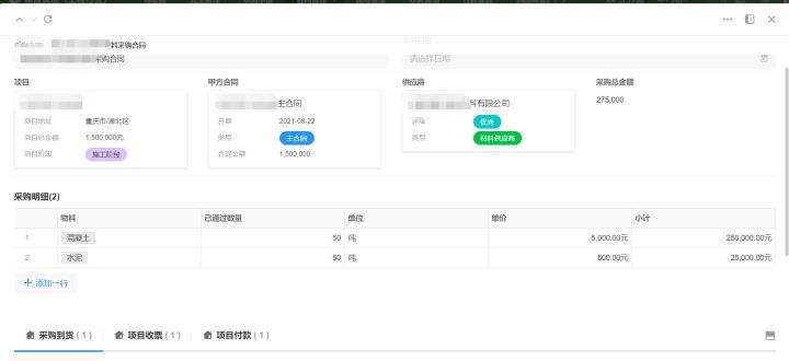 甲方合同、专业分包合同、材料合同各类合同管理,以合同为核心,可以实时查看每个合同的开票、收款、收票、付款的实时情况;也可做收款计划,及时提醒收款。