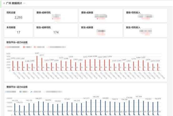 4.根据地区、司机数量、平台、业绩、收入、运力等维度,配置不同的统计图,让数据一目了然。