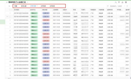 3.配置报表视图,不同维度展示数据。图为曹操租车平台司机个人业绩报表,司机可以在统计表里直接查询个人数据,而对应负责人只需要查看每月的统计报表即可。