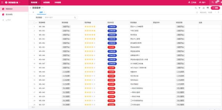 客户的搭建需求需要单独管理,并支持客户前期批量导入需求,以及后期新增需求。除此以外,**所有的需求都要分类立项处理,做到规范化管理。**不仅如此,项目章程规定:**所有后期增加的需求都要经过评估判断。**因此,项目管理应用还需要添加审批工作流。