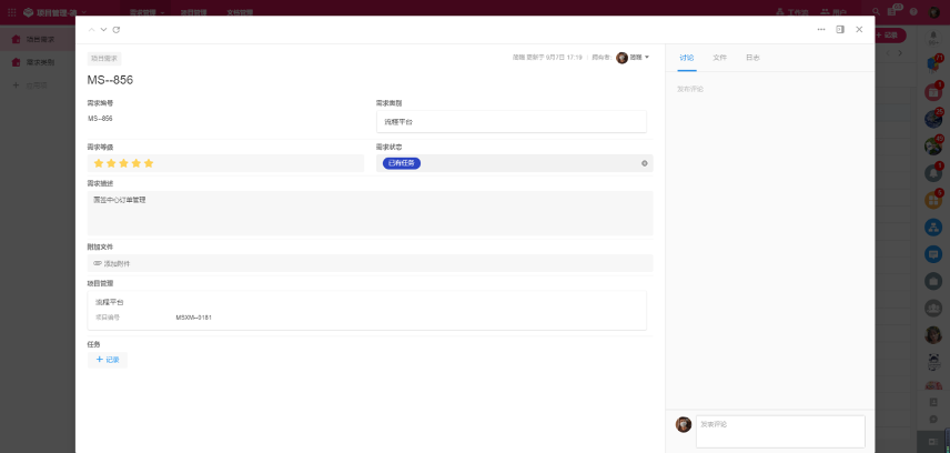 项目正式立项后,就可以创建日常的项目任务了。每当需求被关联到某个新建任务时,系统会将需求的状态同步改为“已有任务”;任务结束后,需求状态会同步为“已处理”。这样我们就可以将需求、任务和项目都连接起来,实现三类事物的完成进度查询和同步。