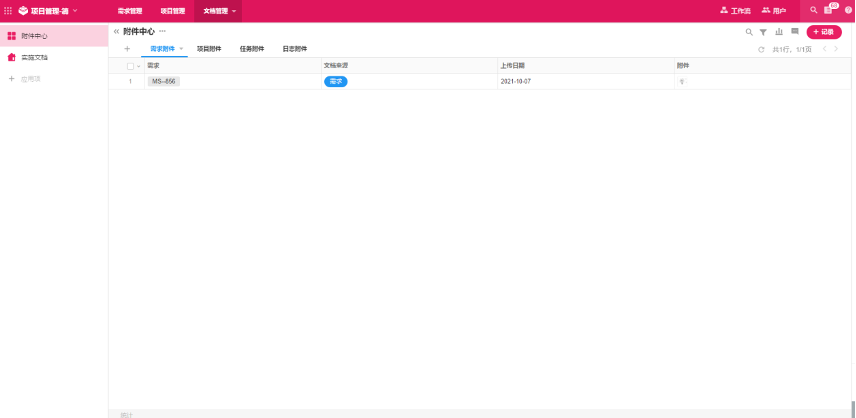 客户提到,有些需求自带附件说明,因此希望有一个地方可以查看所有的附件。所以我们将附件都汇总在文档管理的附件中心。每当有人创建需求、项目、任务和日志附件时,工作流都会在此处自动生成对应记录。