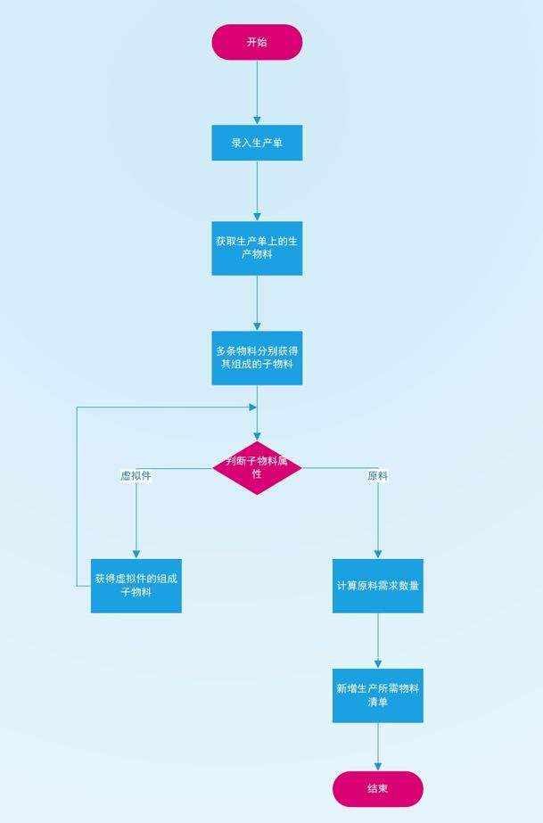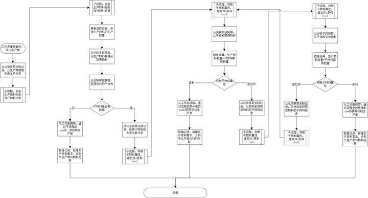 - “子流程 2”与“子流程 3”互相嵌套,来实现流程的无限循环,直到拆解物料清单到子物料属性为“原料”为止,结束后生成【生产物料需求单】。