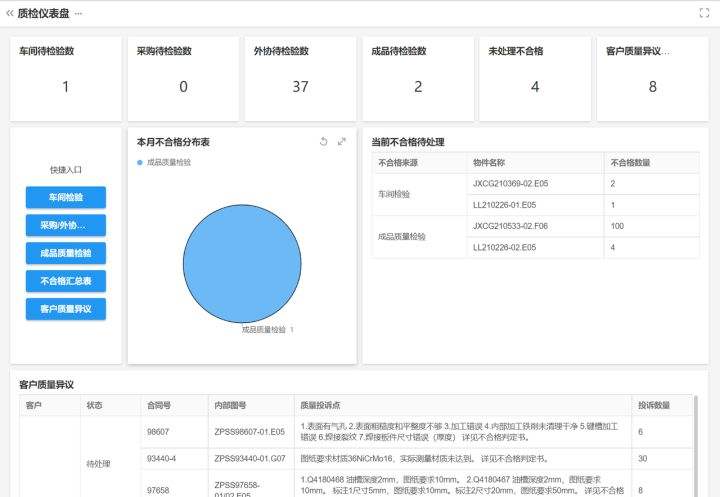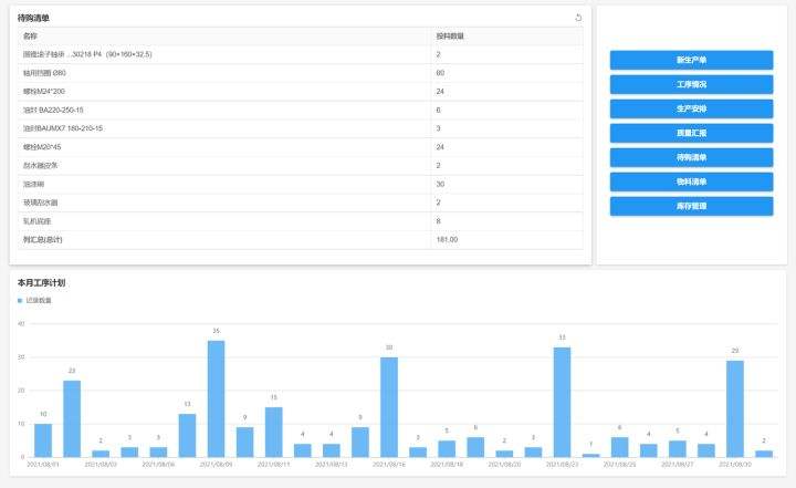 完成工作表与工作流之后,第三步我们需要设计统计看板。面对工作表定义的数据对象,数据明显多而杂,管理者很难依靠明细数据来了解生产过程情况。为了解决这一问题,我们可以通过自定义页面来进行数据统计,并创建一些快捷入口。以下是一些简单示例: